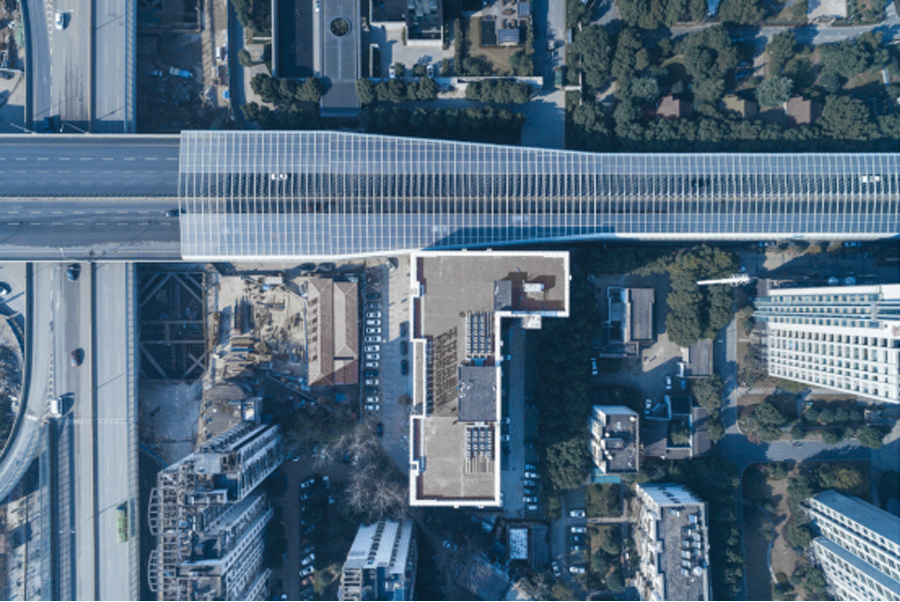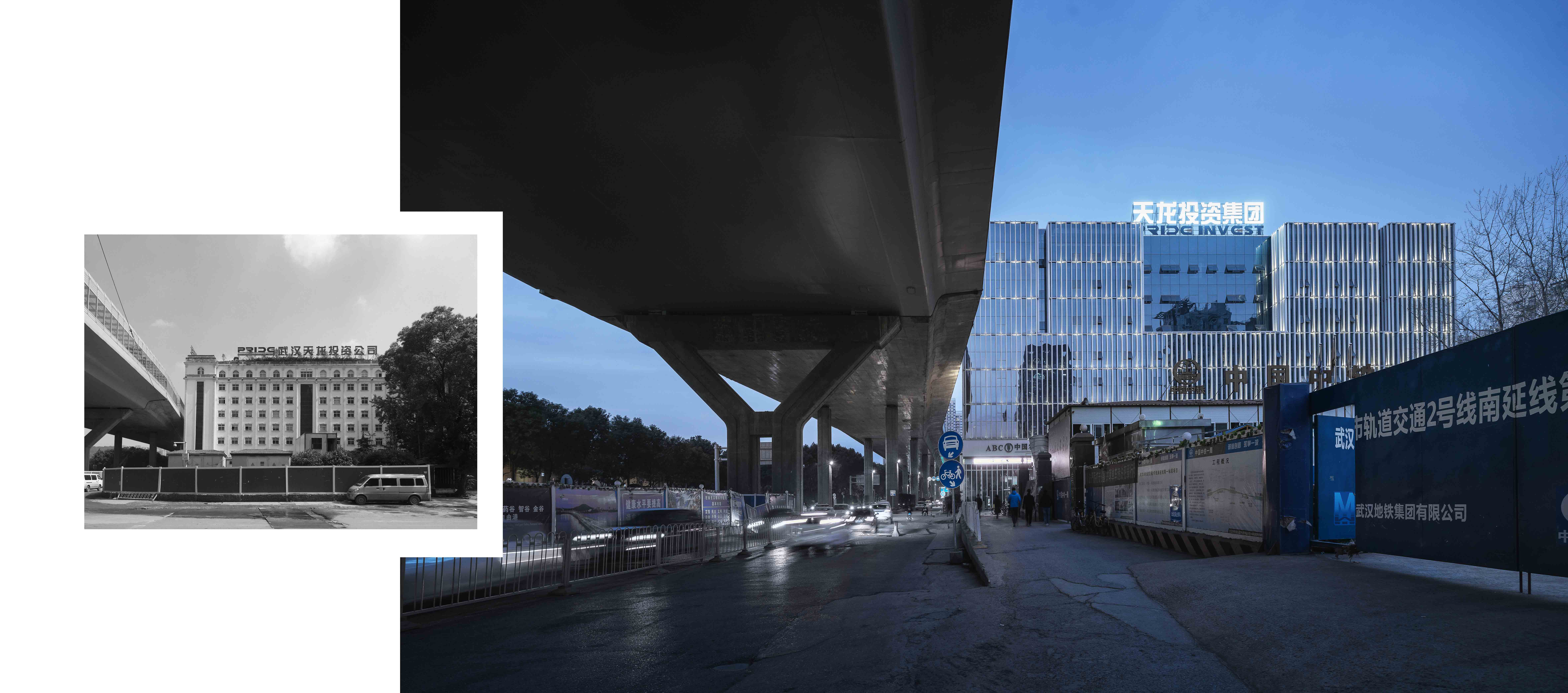 这栋占地面积约3500㎡的"L“形办公楼,含着约10400㎡的建筑面积,却带着迟暮的气息。建筑主入口直面城市干道,侧面一线天接着高架,污染的空气、不间断的噪音、缺失的绿化侵蚀着建筑的躯壳,所接连的现代化高层又使它相形见绌,压抑了建筑的精神。