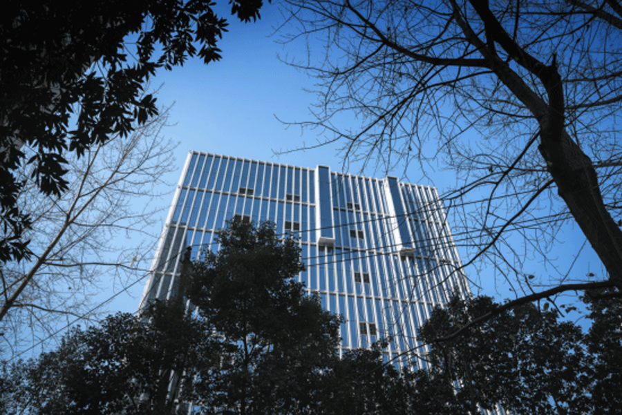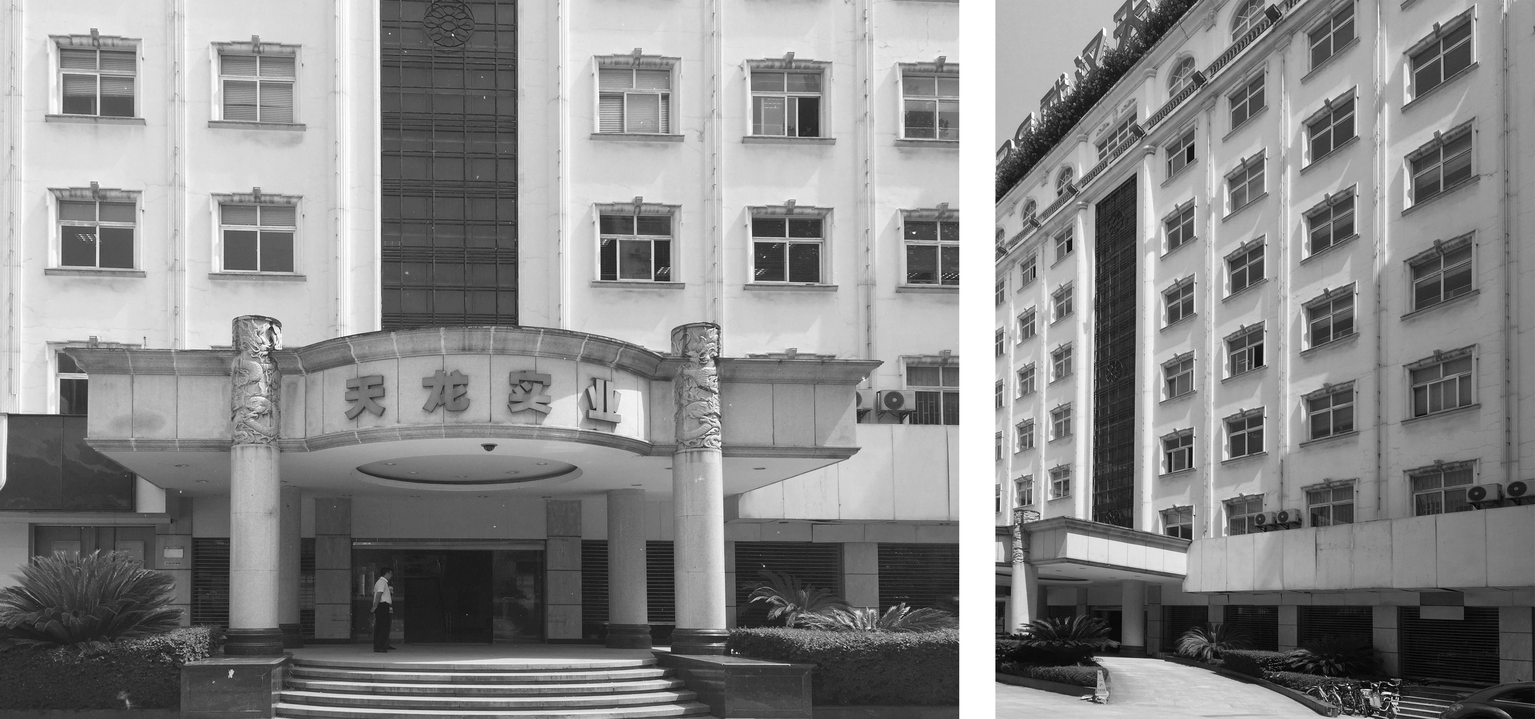 这是一幢坐落在高架旁的老楼,屋顶漏出的些许绿植为整栋楼增添了丝丝生机,而八层的高度在它被建造的年代应该是不负“大厦”之名的。浅黄色的涂料看起来还带着新意,似乎是刚翻新过,但那些重复又略显呆板的窗洞;那些简化且比例失调的檐口、柱式、天花;那些茶绿色的玻璃和白色的塑钢,无一不在呐喊着这栋楼此时的窘迫现状。