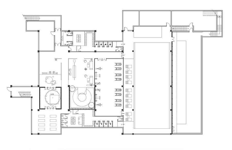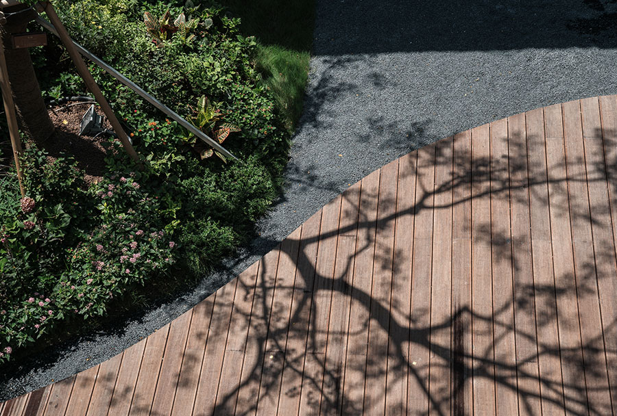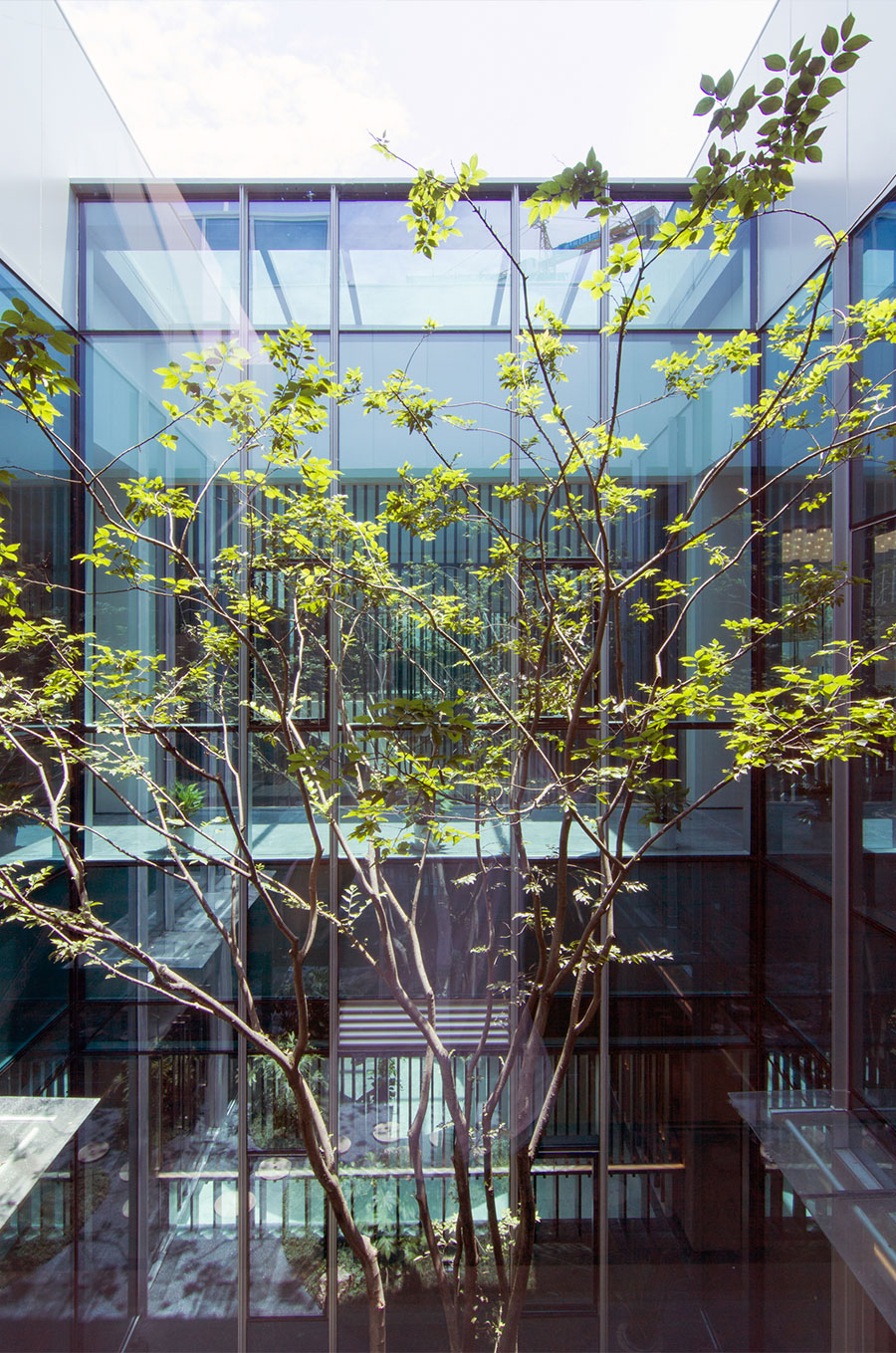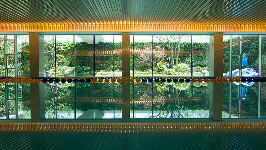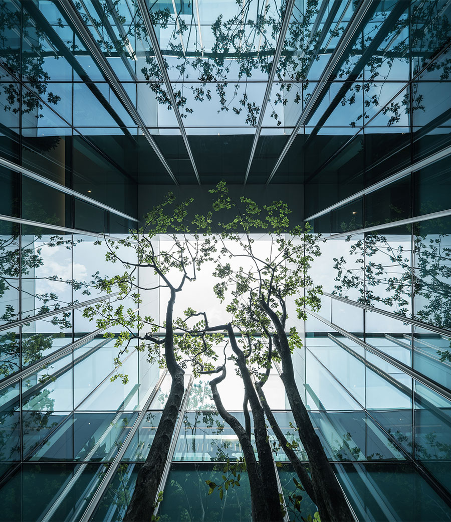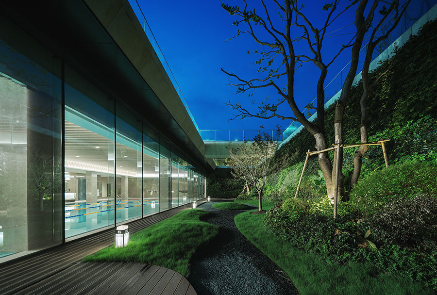 建筑中的景观与景观中的建筑。用植物造景的风景意向拓展建筑内部的景观空间。中庭,自负一层而起且无顶部遮盖,光线便很好地穿透下来,通过玻璃幕墙把禅意的植物景致反射,再反射,像汇聚于钻石之上的光晕般将景观往建筑的四面八方层层叠叠扩展开来。地下室内泳池,玻璃幕墙之外的下沉庭院中,三面垂直绿墙,通过不同色彩、叶型的植株布局出山水浮云的自然形态,令使用者感受到被景观包裹的建筑场所私密与安全。