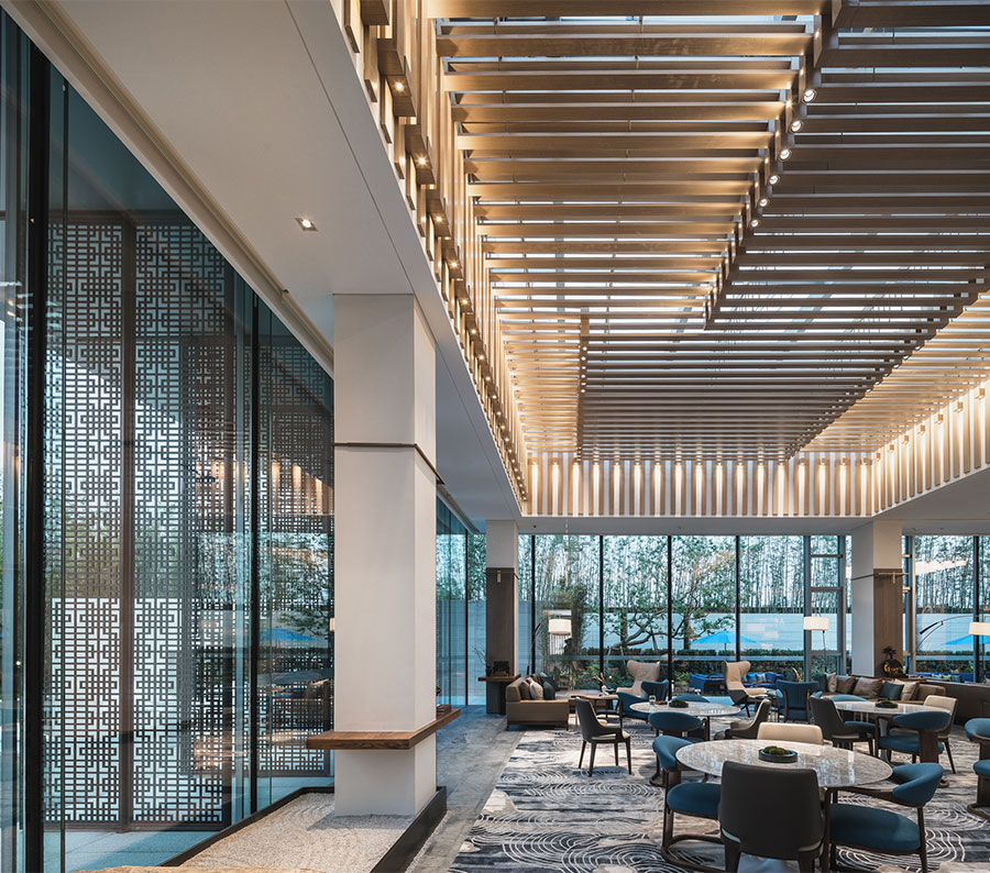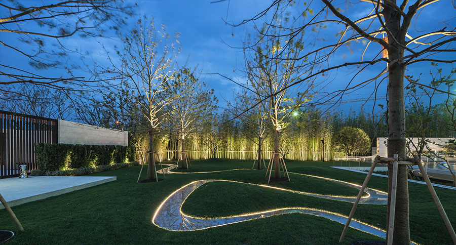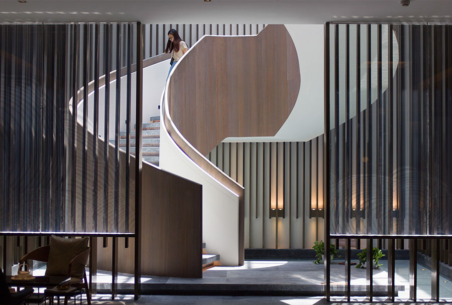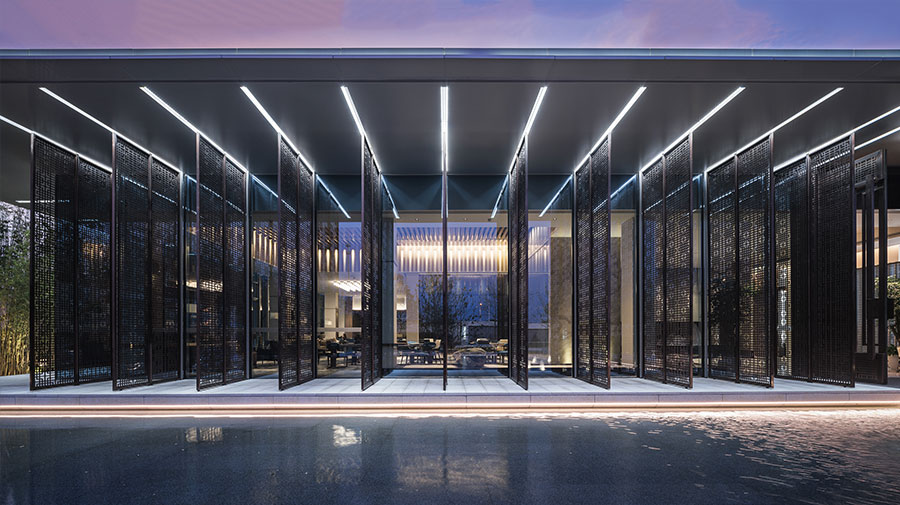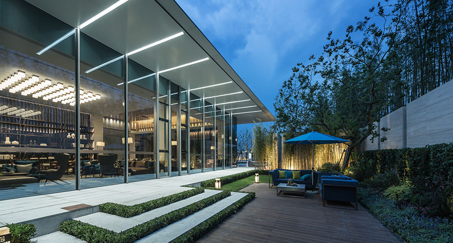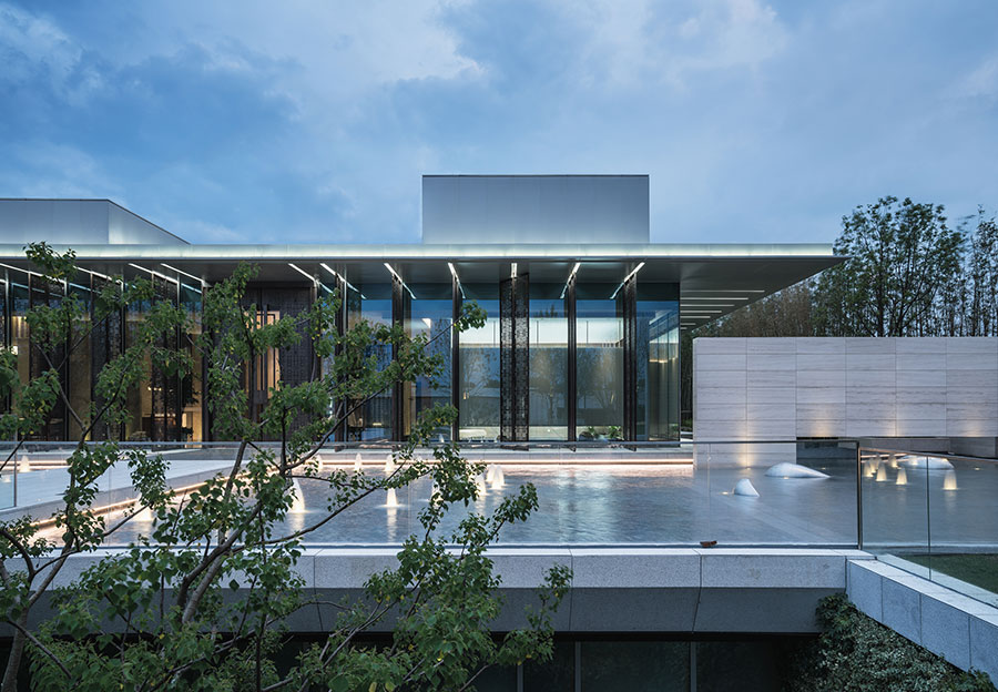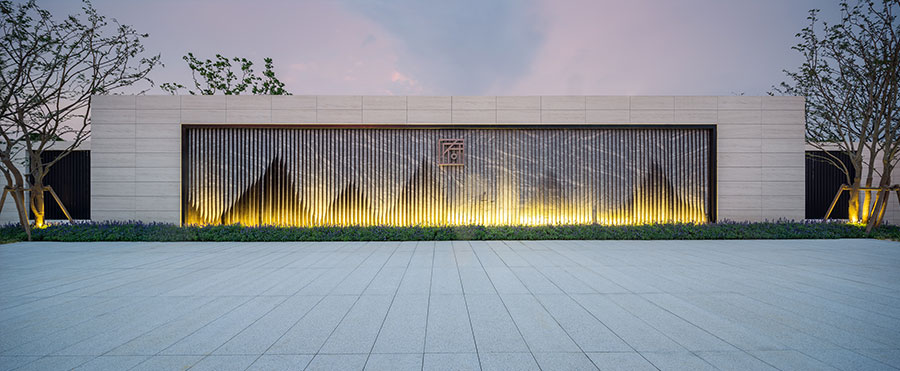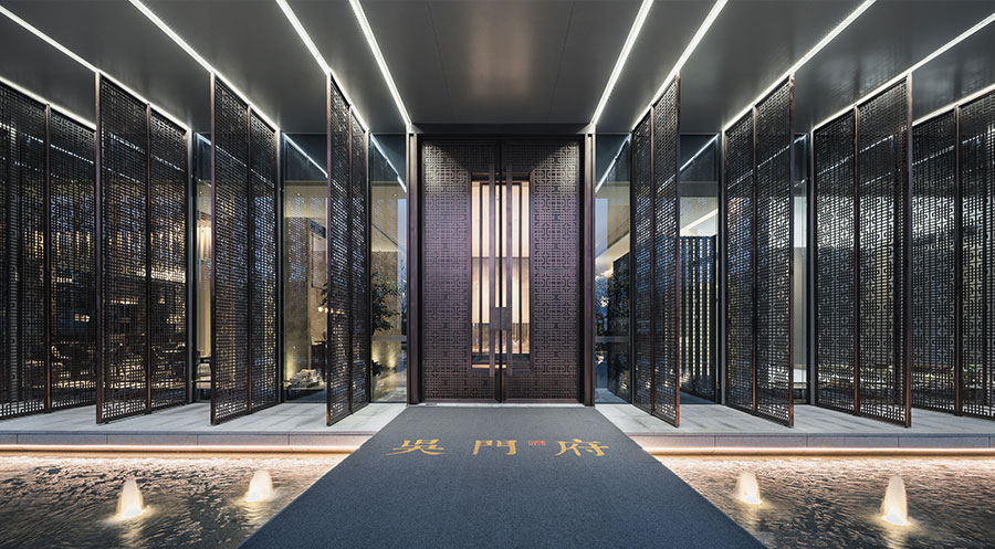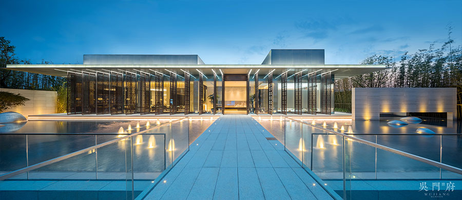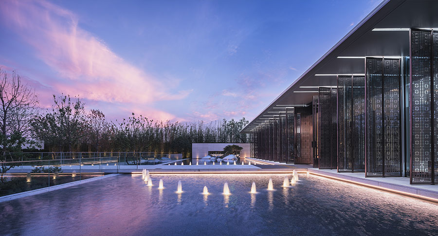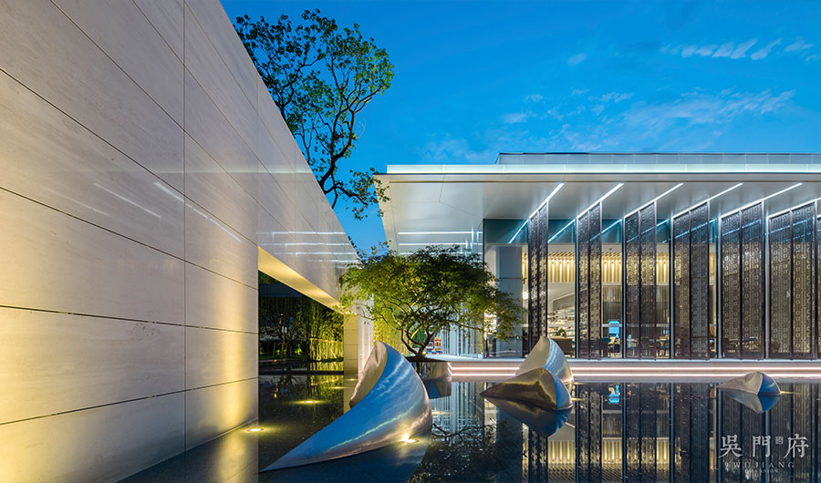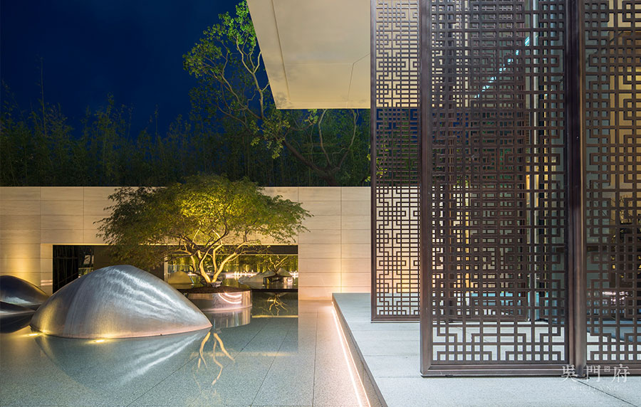 此营造方式让室内的空间序列依旧呈现院落般的递进与起承转合。同时也让景观傍水造园,相互映衬,力求内外空间互通互融。这样让室内外层层院落的叠合与联通藏风聚气,亭台楼阁、水榭连桥等各个元素一起,在城市主界面上反映出了公共空间到私密空间的完整转换。