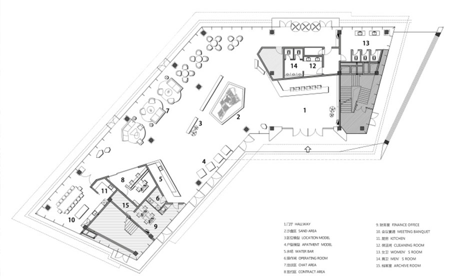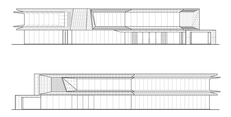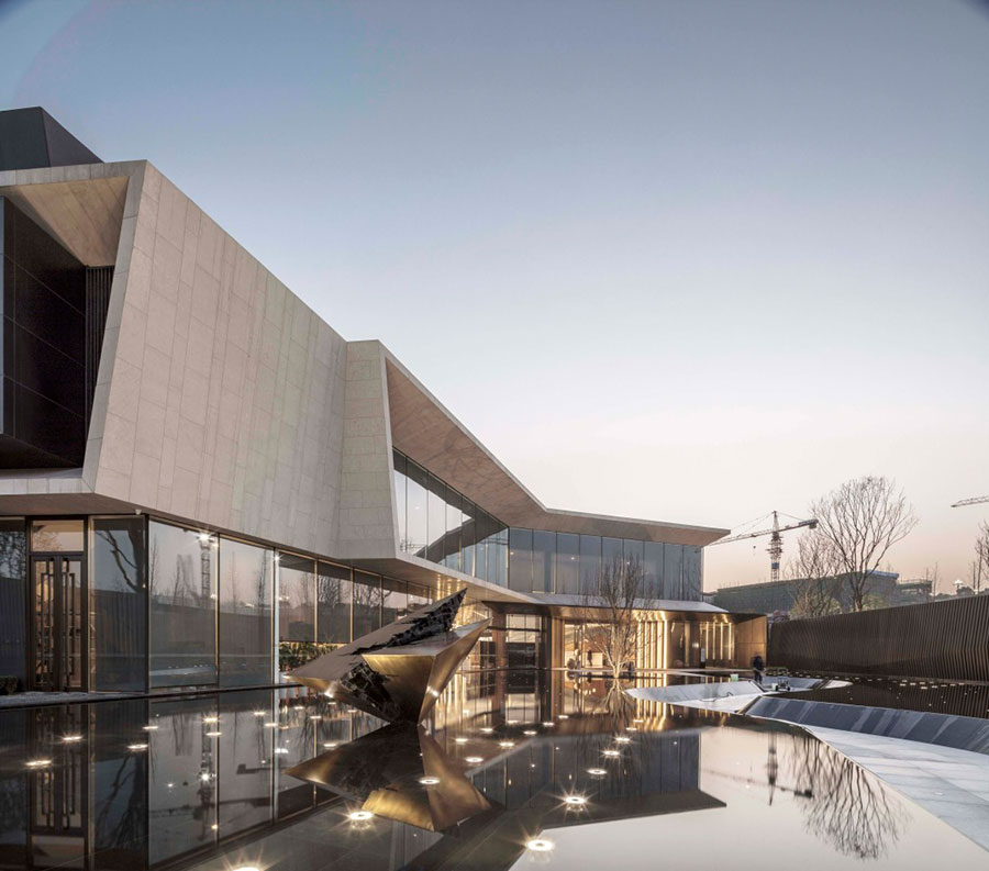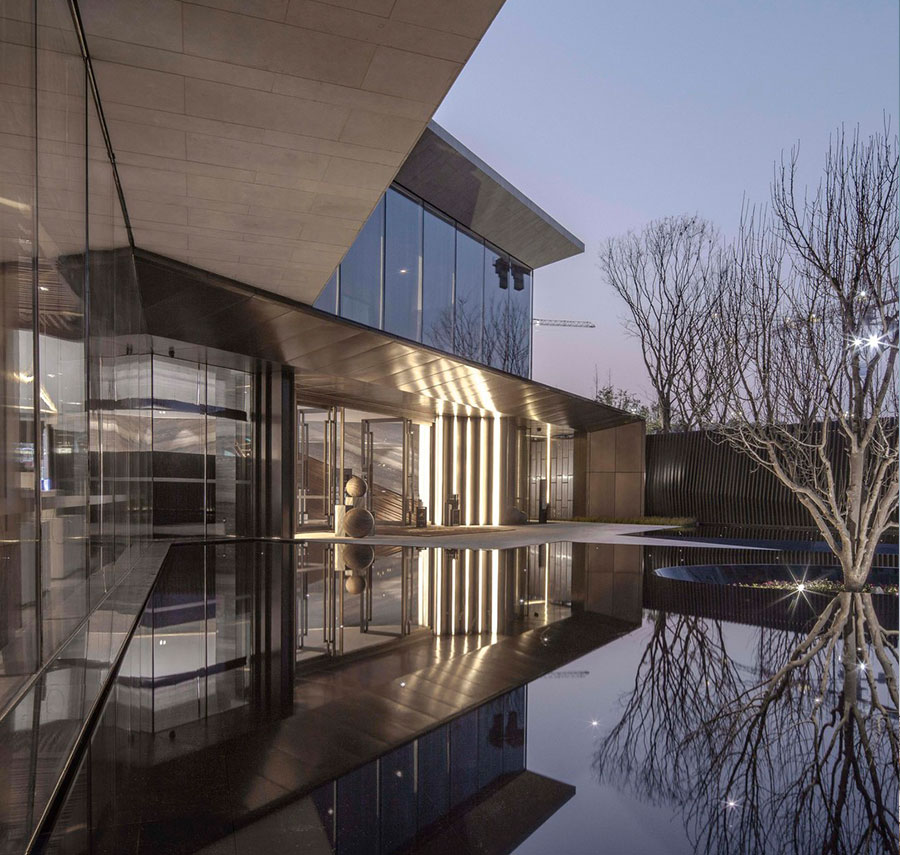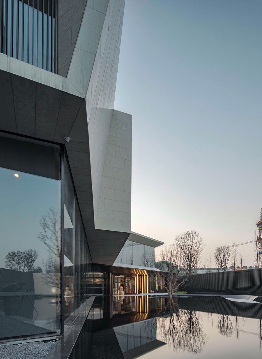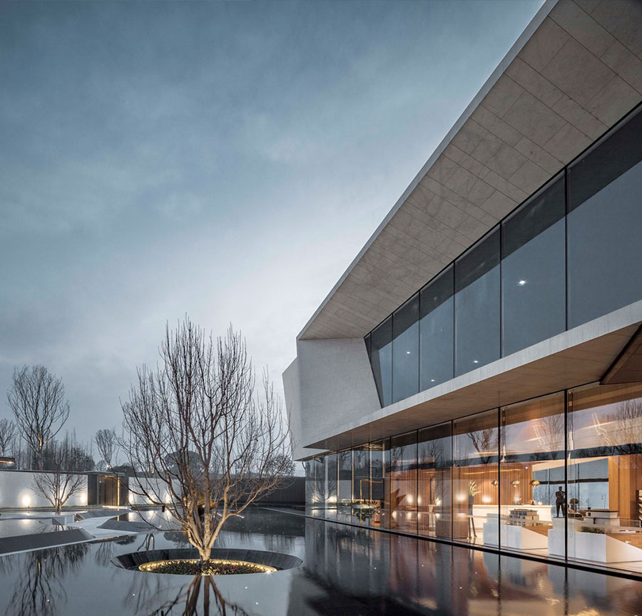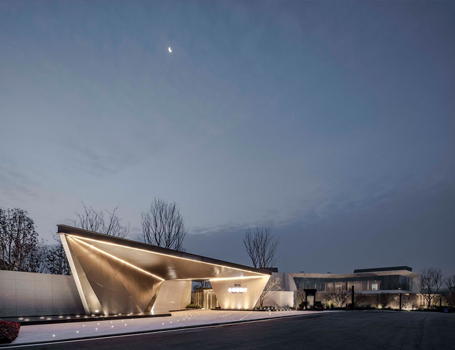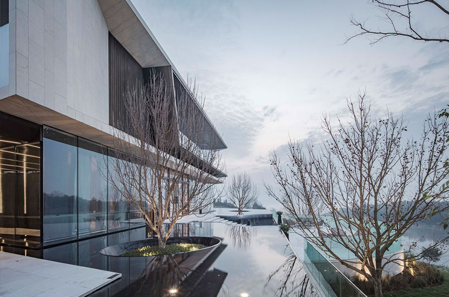 两层建筑体量沿湖面借势延展,建筑一层设计为全通透玻璃幕以实现内部观湖的全景视野。上层体量悬挑于空中,以折板形态构成多个景框,与外部环境产生互动。实体部分利用石材和金属两种不同材料形成相互套叠的效果,使整个建筑呈现出现代雕塑般的张力。