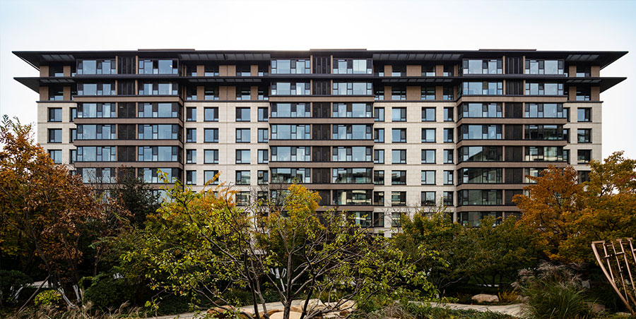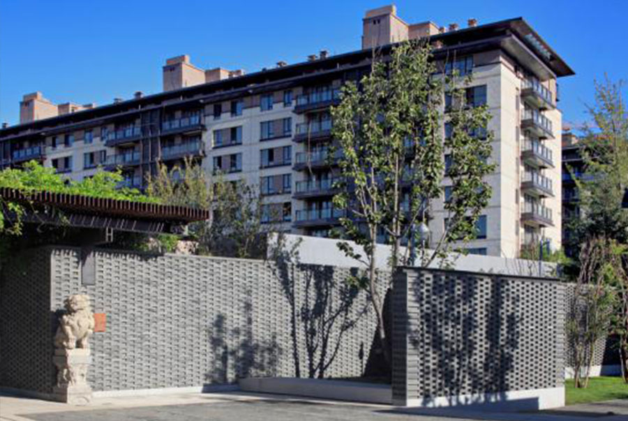 轴线空间融合地域特征,结合建筑体量,摒弃江南园林的精巧,重点打造具有仪式感的空间与景观轴线,营造磅礴气度;建筑对称坐落在的轴线两侧,并通过建筑与院墙自然形成了街巷、院落。由中轴到街巷,由开场大景观到围合院落,完成了从大尺度到小尺度的空间过渡,也完成了从仪式感到私密的心理过渡。楼座之间的院落以及私家的庭院重现了北京四合院所显现的向心凝聚的气氛。一方面,家庭保持了与外部世界的某种隔绝,常保生活的宁静与私密;另一方面,根源于农业生产方式的一种深刻心态,又使得中国人特别乐于亲近自然,愿意在家中时时看到天、地、花草和树木。