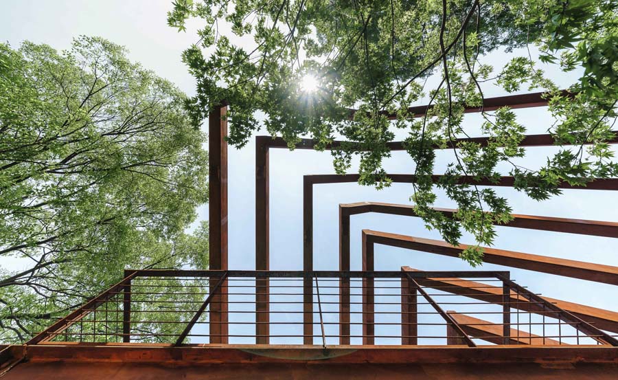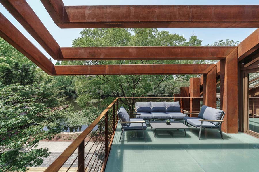 钢结构具有较强的可塑性,入口灰空间通过对坡屋顶元素进行提取,将单体空间转译成面空间,利用锈蚀钢板的折线性处理,营造出入口的提示性空间。