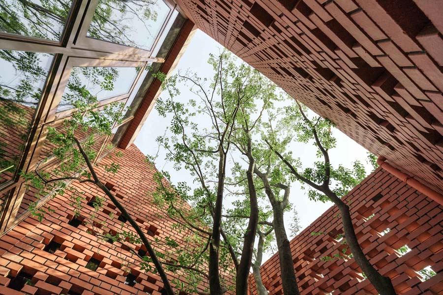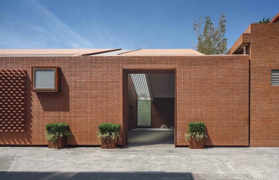 玻璃房将原有山墙面等比例缩小,通过虚空间连接原有建筑与钢构架。加建庭院同样延续原有山墙面的尺寸,使空间连续而富有变化。砖延伸至屋顶以及镂空砖的处理使建筑与周围环境有机融合又富有变化。