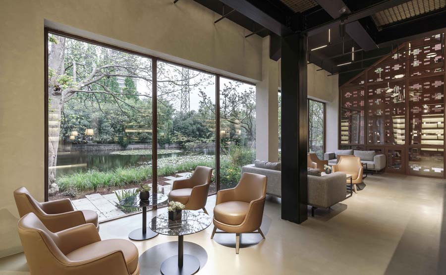 聚合了阅览、展示、品茶、休憩等综合性功能,通过增加局部二层以及入口玻璃房的方式,保留原有建筑结构,适应新的功能需求。