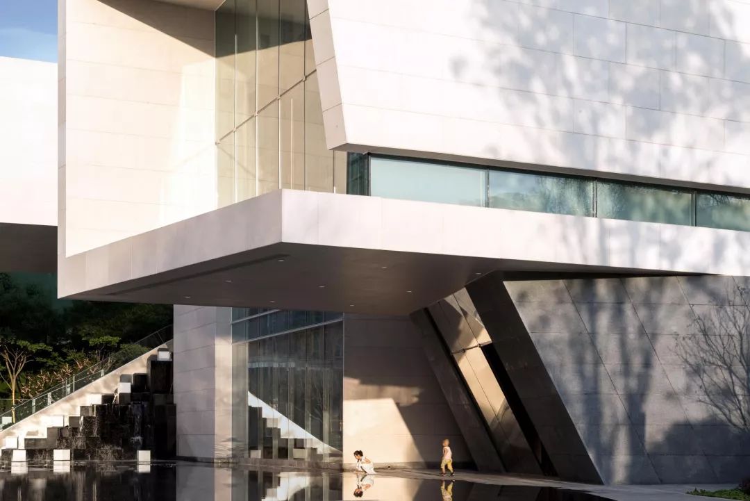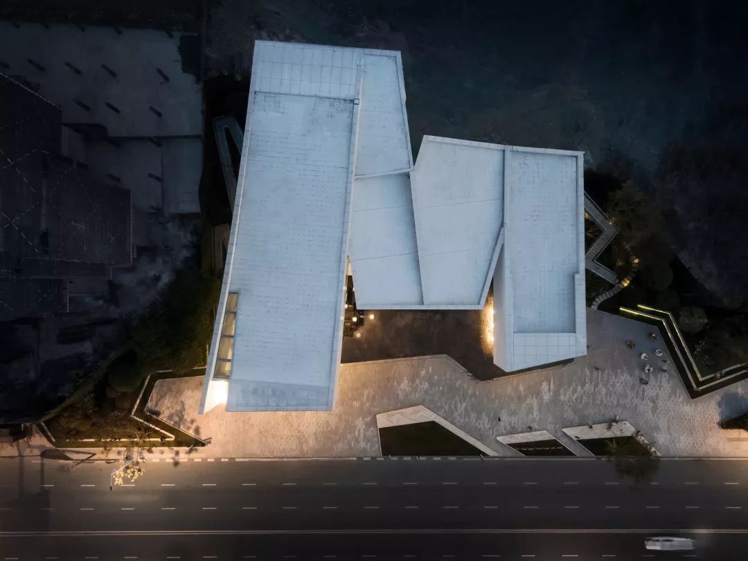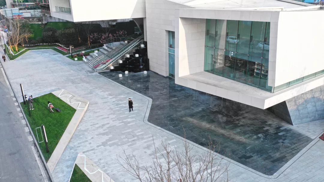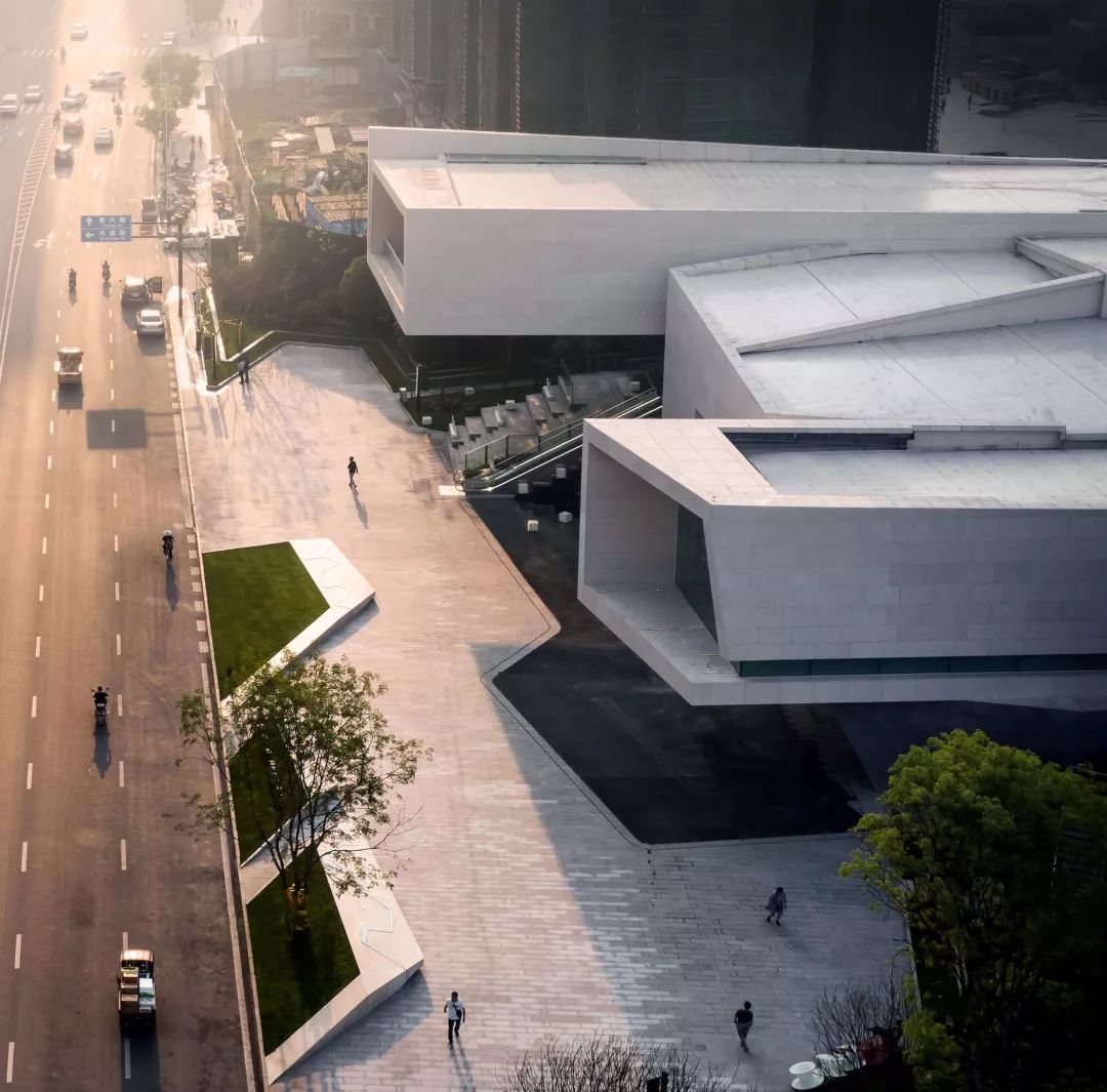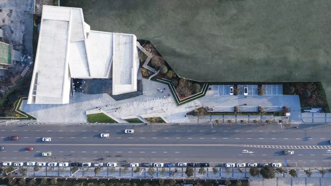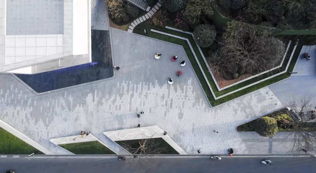 景观设计与建筑密切结合,折线线条取于建筑形体,利落干净,一同呈现出独特的场地特征;同时通过沱江水景的引入,塑造出具有地域文化与本土记忆的场所空间。