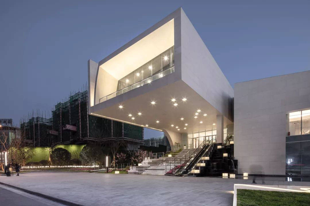 建筑形体通过削切将底层打开,置入入口大台阶,同时台阶上空形成了15米长的大悬挑,共同形成张开的震撼灰空间。建筑的大台阶既是小区对城市的形象展示,也是反馈给城市的都市会客厅。