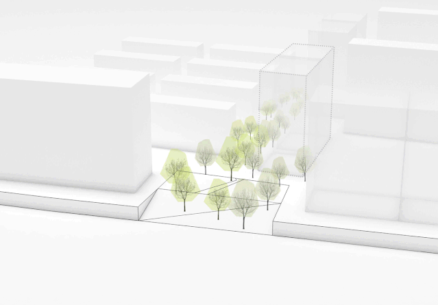 建筑的体量如果处理不好会对城市沿街面造成压迫,或被周围建筑群吞噬。针对该现状,我们希望能创造出一个给该路段聚集人气、提供休憩的的公共场所,进而激活整个片区,创造自由、活泼的氛围。