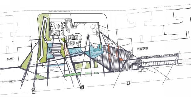 场地北侧面向城市次干道,其他三面被周边建筑包围,且场地内道路与城市道路的高差近5M。因此需要通过巧妙的设计来化解场地的限制条件给建筑带来的束缚,表达建筑自由。