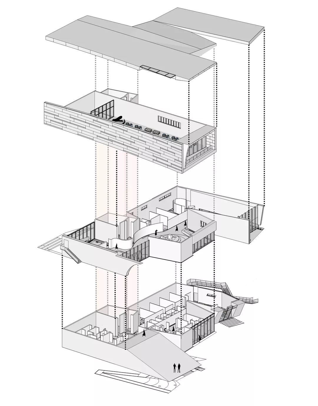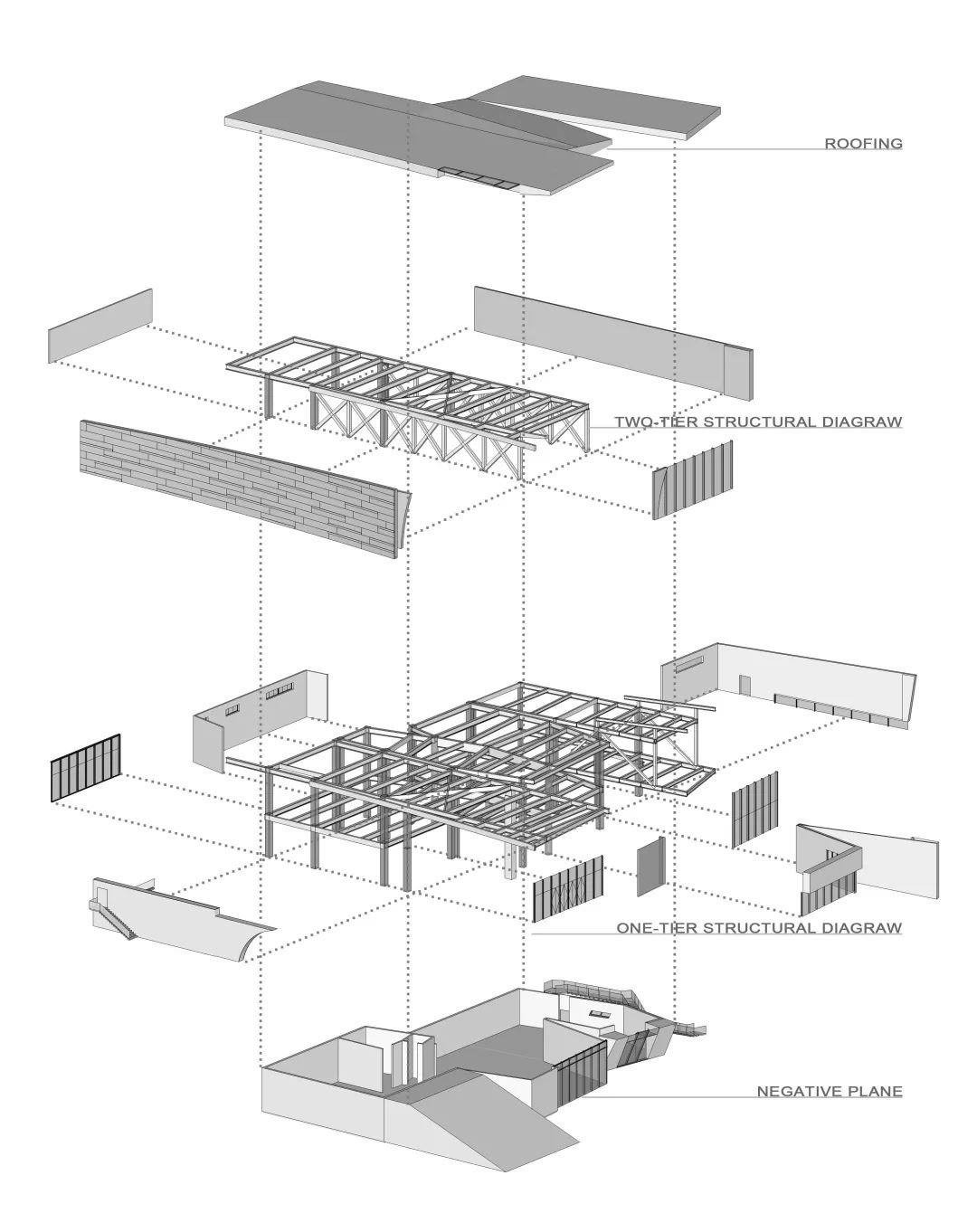 建筑由三层组成,地上两层地下一层,一二层为主要使用空间,地下一层为辅助功能。
