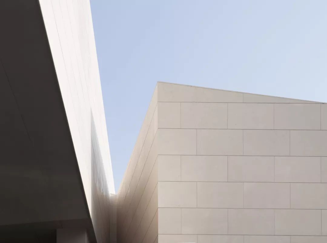 建筑外皮主要有三层主要材料组成,葡萄牙米黄色石材为主要材料,小悬挑部分采用宝石蓝石材。吊顶部分采用氟碳喷涂仿石铝板,玻璃均采用超白高透LOW-E玻璃。复杂的形体易使用简单的材料组成,才能更好地实现建筑的纯粹性。