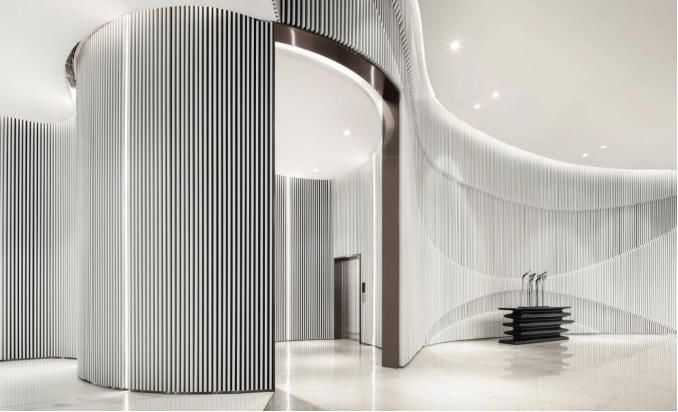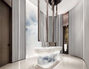 室内空间旨在创造“一江、一城、一院”的模式。进厅以江为构思,白色浑水格栅搭配水墨地面和夹绢玻璃背景,勾勒出内江的江水文化,给人以遐想;中心展示区以城为构思,空间构成主体以白色浑水格栅为主,序列变化的黑色格栅增加空间层次,水滴和弧线元素让空间充满了灵动性;洽谈以庭院式的布置步入方式,空间舒适灵活,以东方禅意为主题,让客户宾至如归。
