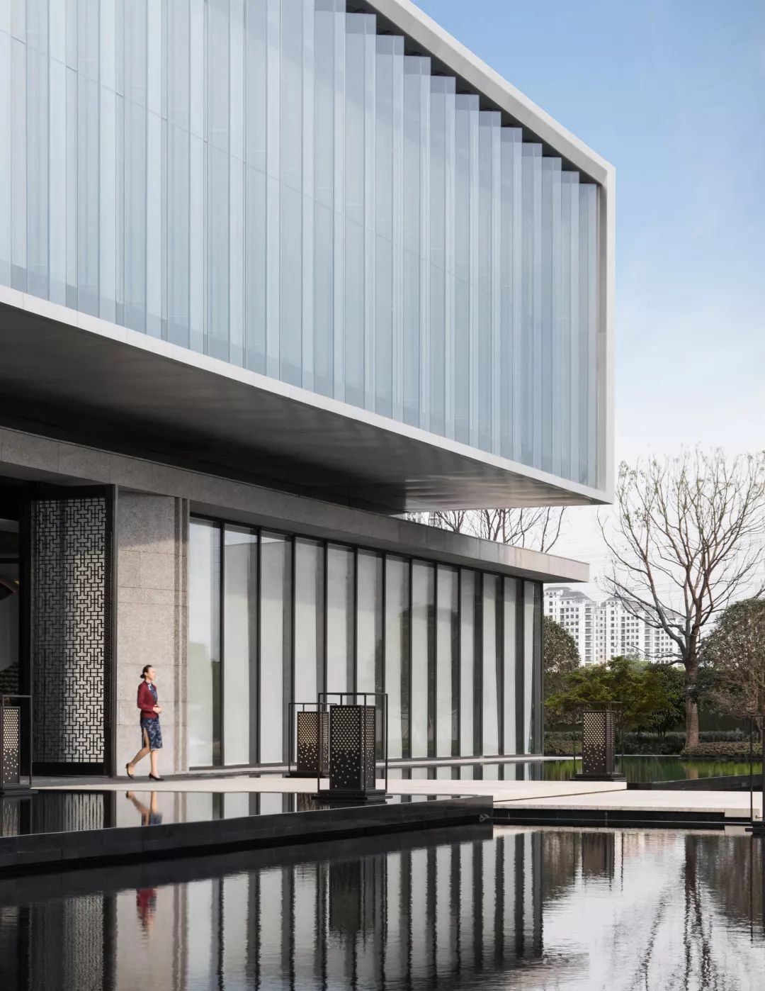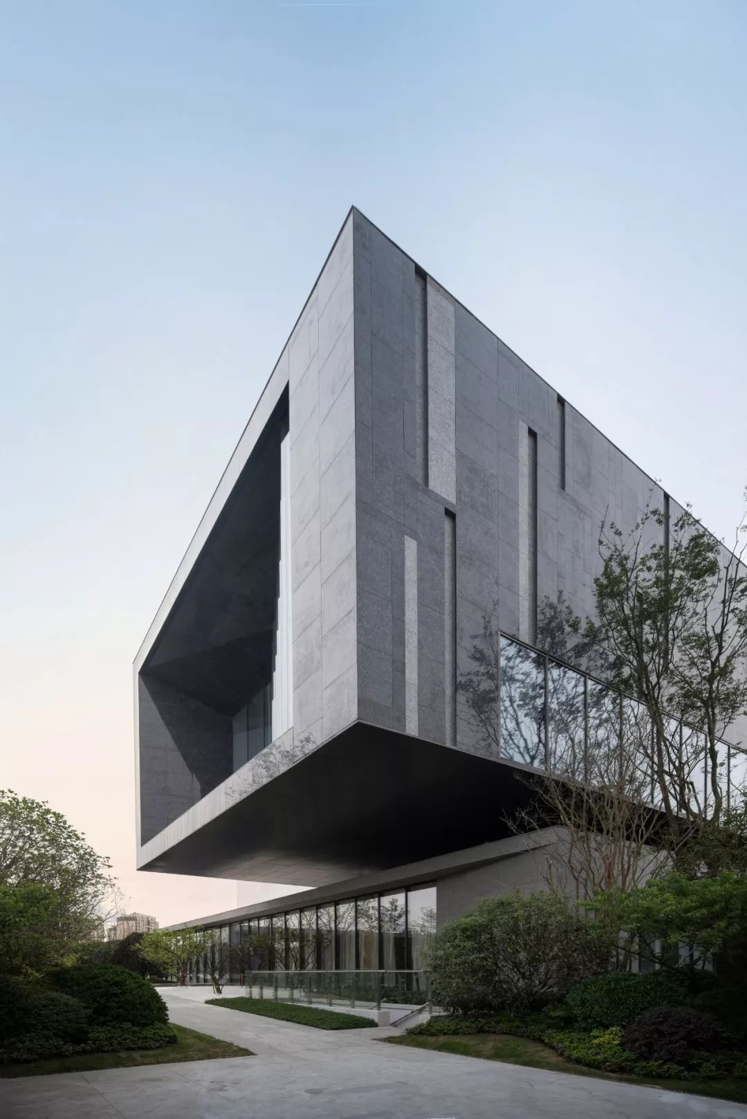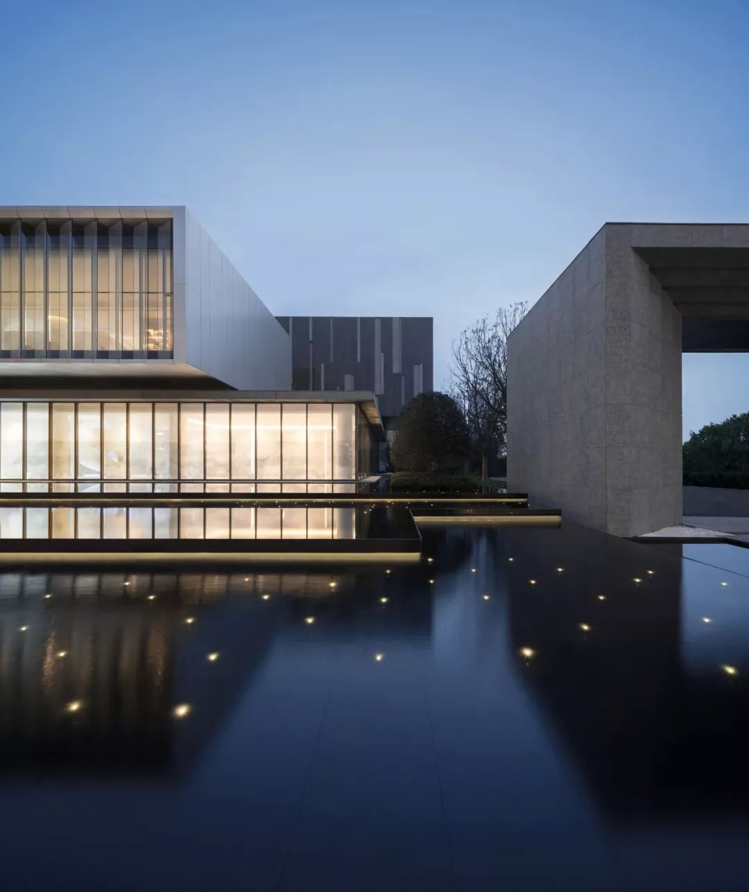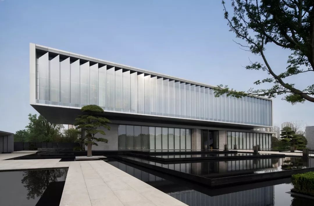 建筑大体由三个体量堆叠而成:浅灰色的首层体量扁平舒展,浅卧在水中,吐纳三个方向的人流;银白色的体量漂浮于首层之上,透明的经折朝向运河徐徐打开,展示山水也拥抱山水;灰黑色的体量继续上升,但不会离开,作为前两者的背景,展现着器度与分量。