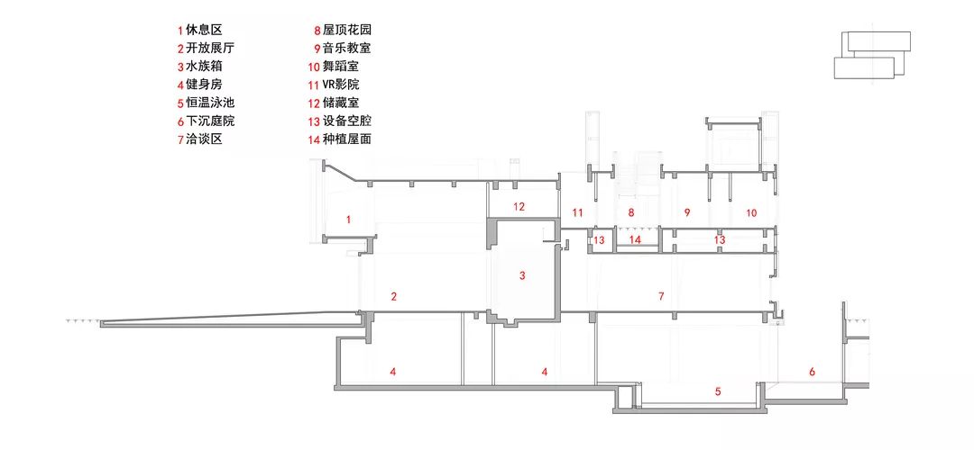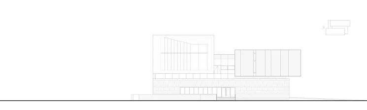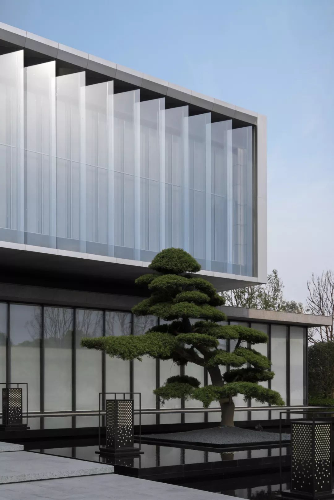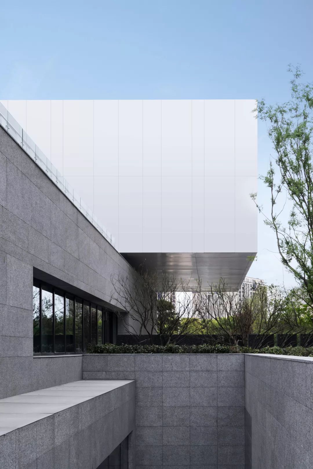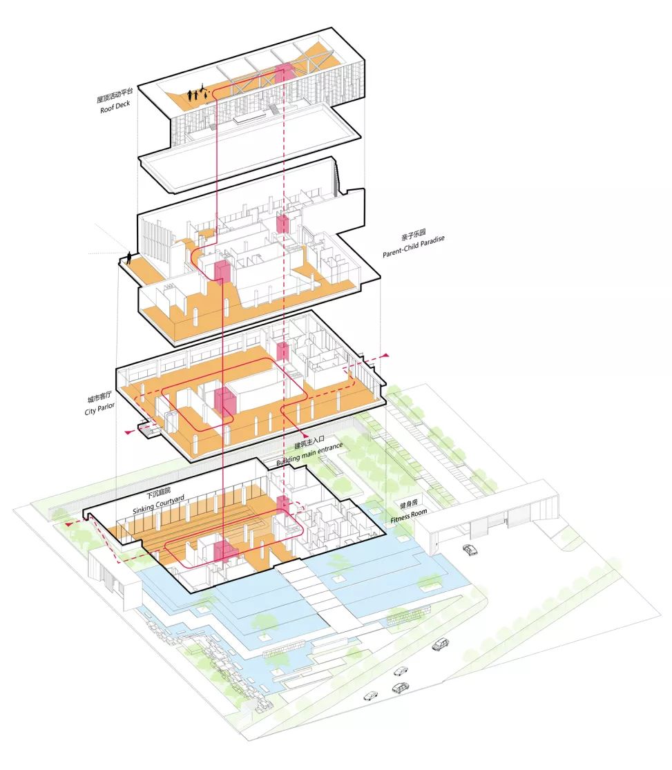 建筑大体由三个体量堆叠而成:浅灰色的首层体量扁平舒展,浅卧在水中,吐纳三个方向的人流;银白色的体量漂浮于首层之上,透明的经折朝向运河徐徐打开,展示山水也拥抱山水;灰黑色的体量继续上升,但不会离开,作为前两者的背景,展现着器度与分量。