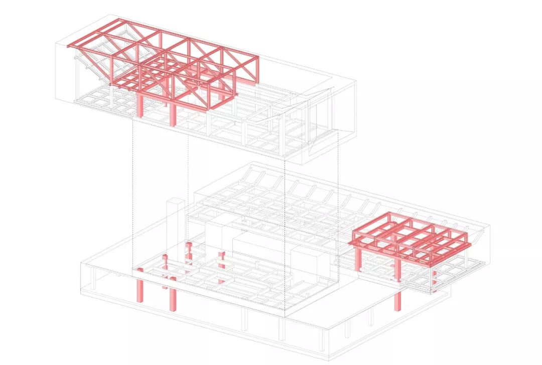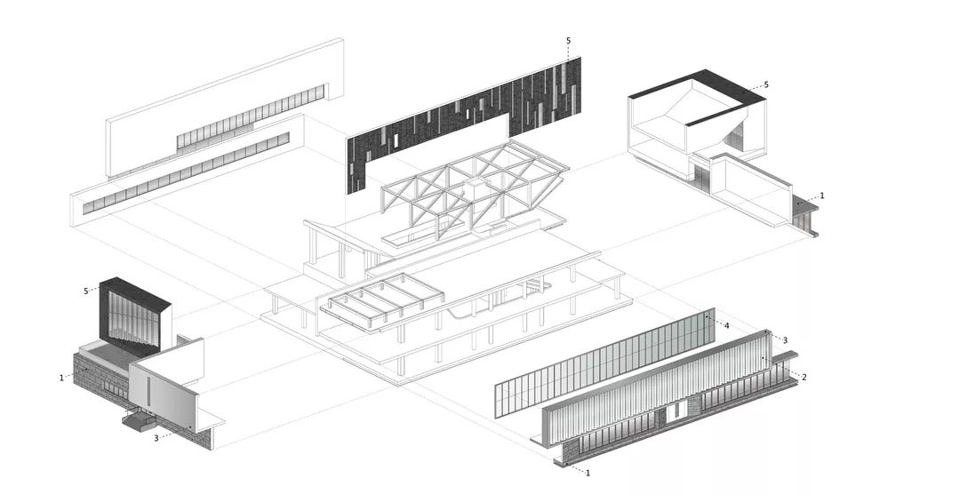 本案中建筑的生成就像细胞的分裂与分化。一个长方形,分裂成上下平行的两张:下面的继续分裂成四片叠在一起,上面的膨胀成为长方体,再分裂成三瓣儿堆放;四叠儿变成水面,又伸出了路;三瓣儿成为质色各异的盒子,并留下了门窗。逻辑是设计的灵魂,简洁但不一定简单。
