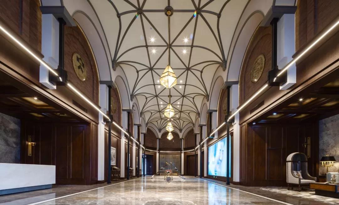 随后步入艺术长廊,半弧形的拱廊采用了贴近自然的实木,层层迭至,延展开来。书架上摆放着各种类型的图书,坐在淡黄色的暖光之下,窗外点点绿意透过大面积的玻璃窗映射出来,优雅文艺的氛围油然而生。