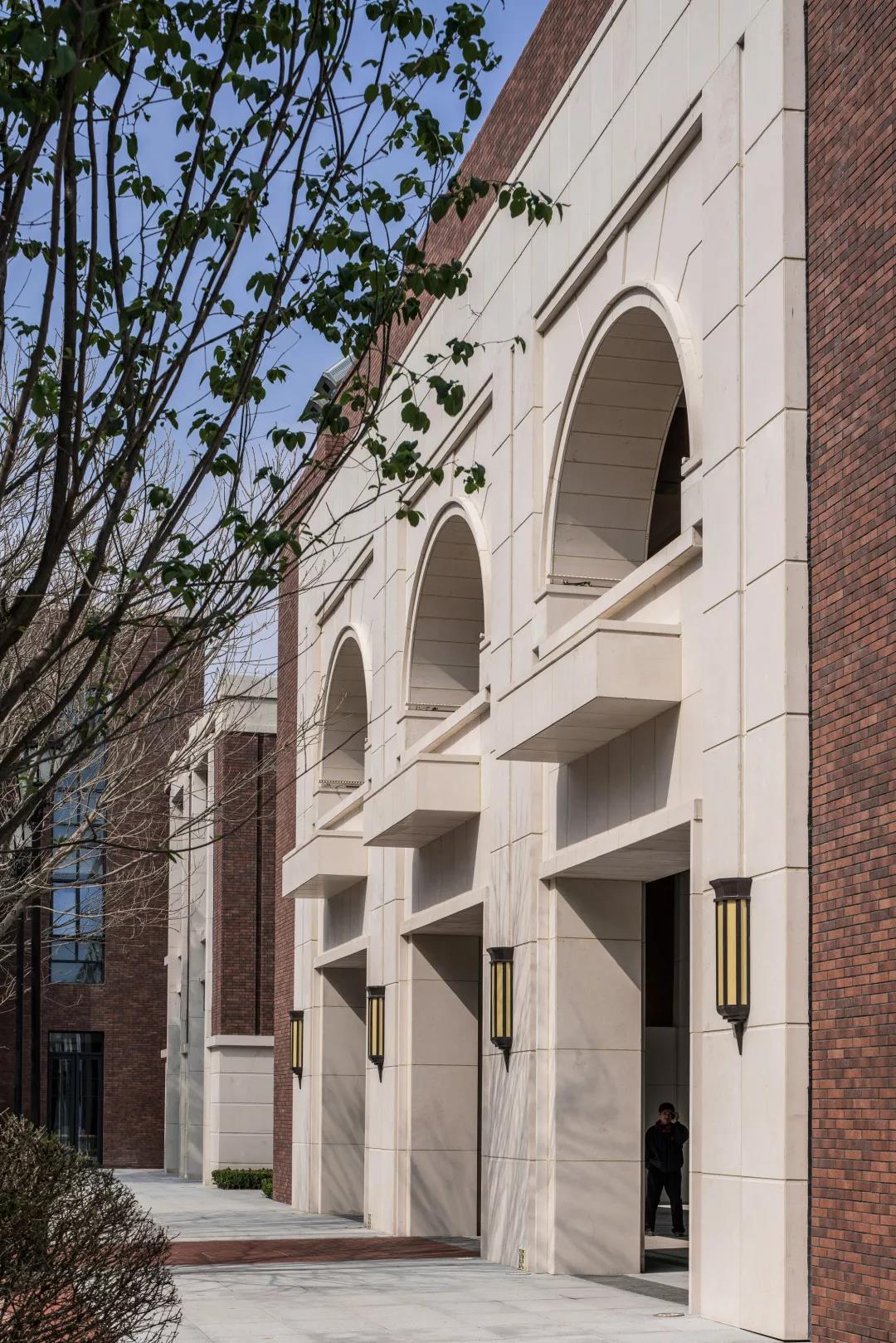 示范区建筑立面以米黄色石材、红色面砖、深灰色金属铝板、玻璃为主要建筑材料,呈现出古而新的学院风格,其将怀古的浪漫情怀与现代人对生活的需求相结合,兼容华贵典雅与时尚现代。