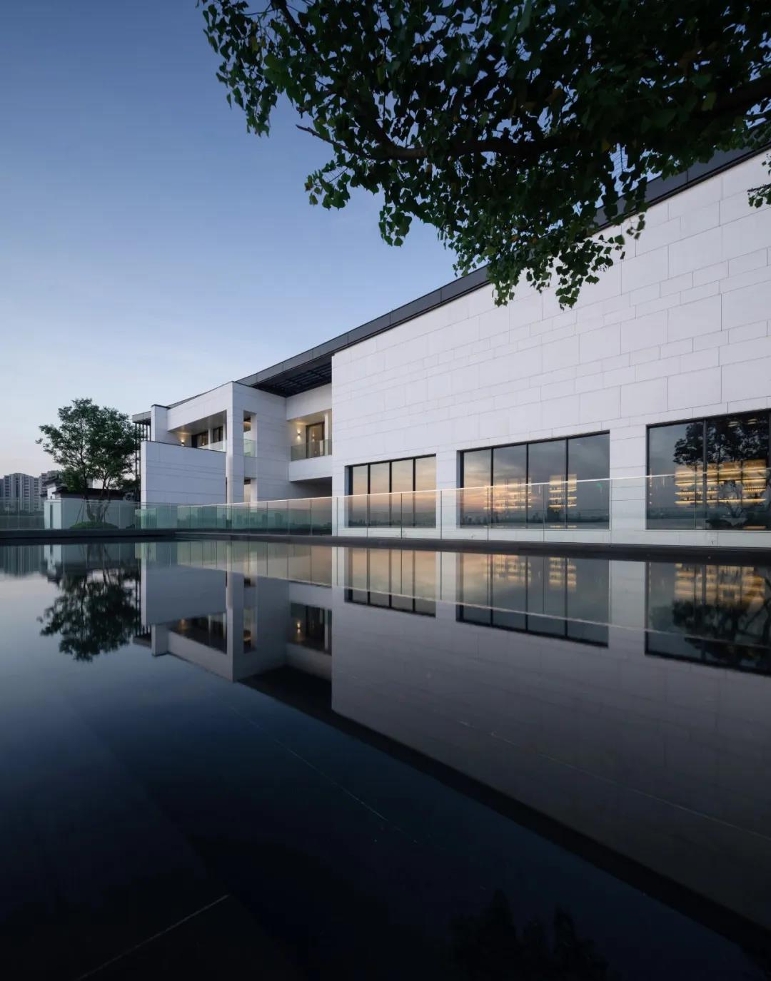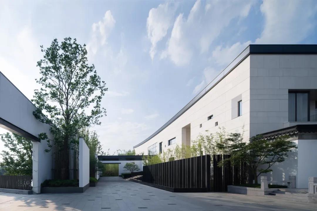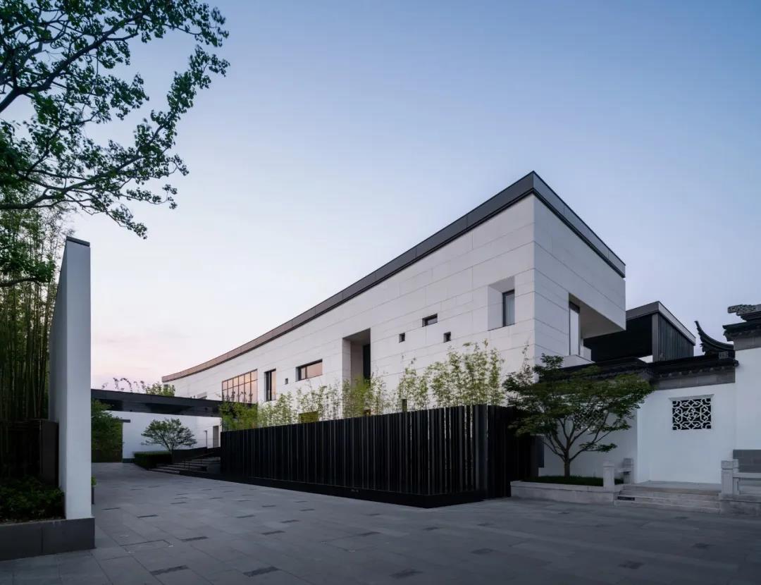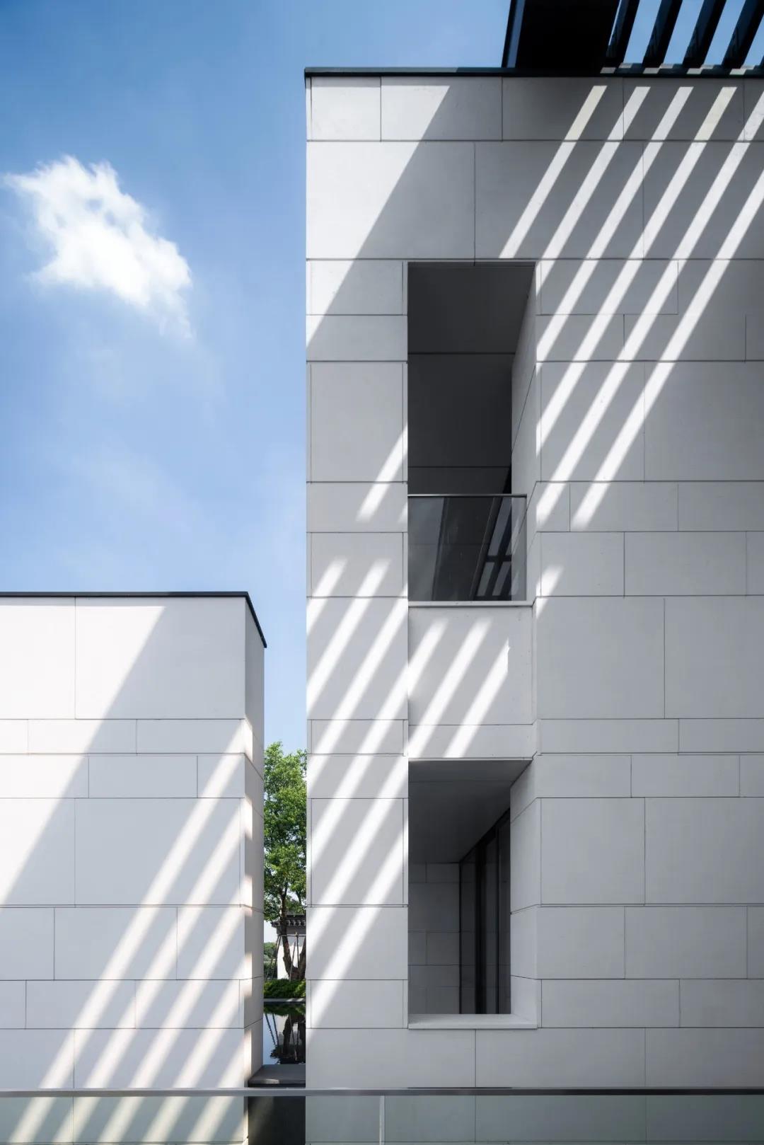 建筑采用两种色调,白色与深灰色。选用质感与耐久并重的白色砂岩和铝材,以现代工业技术呼应江南的水墨意境,与当地民居院落的形象保持一致,微妙谦和地融入环境。