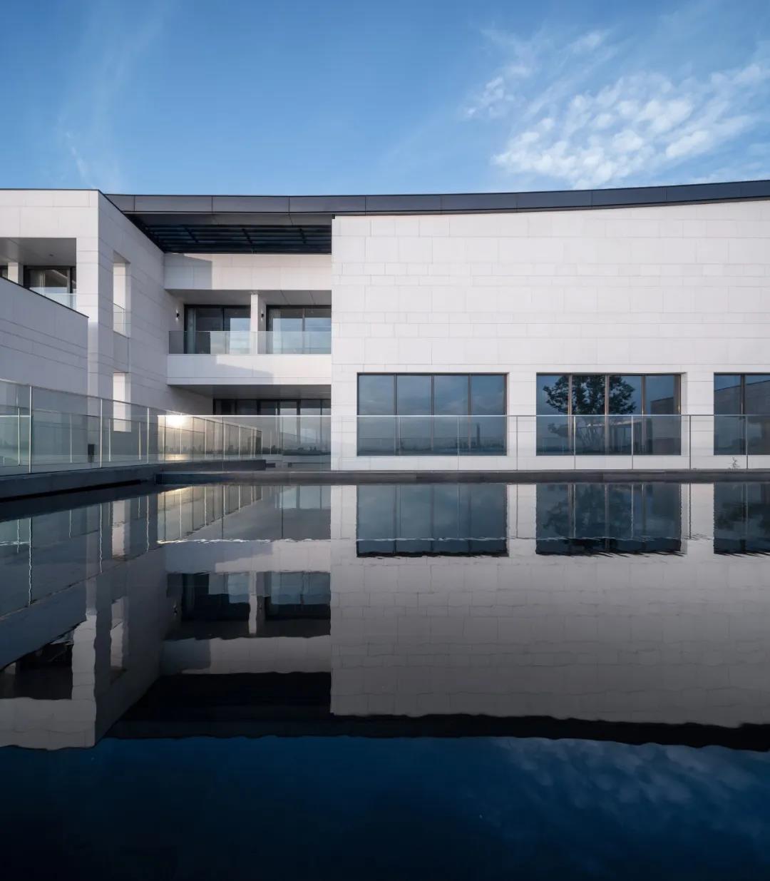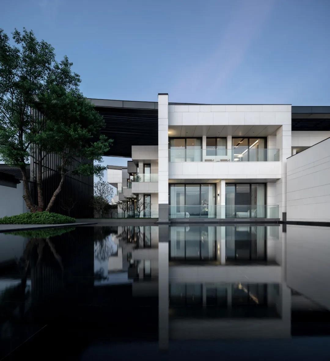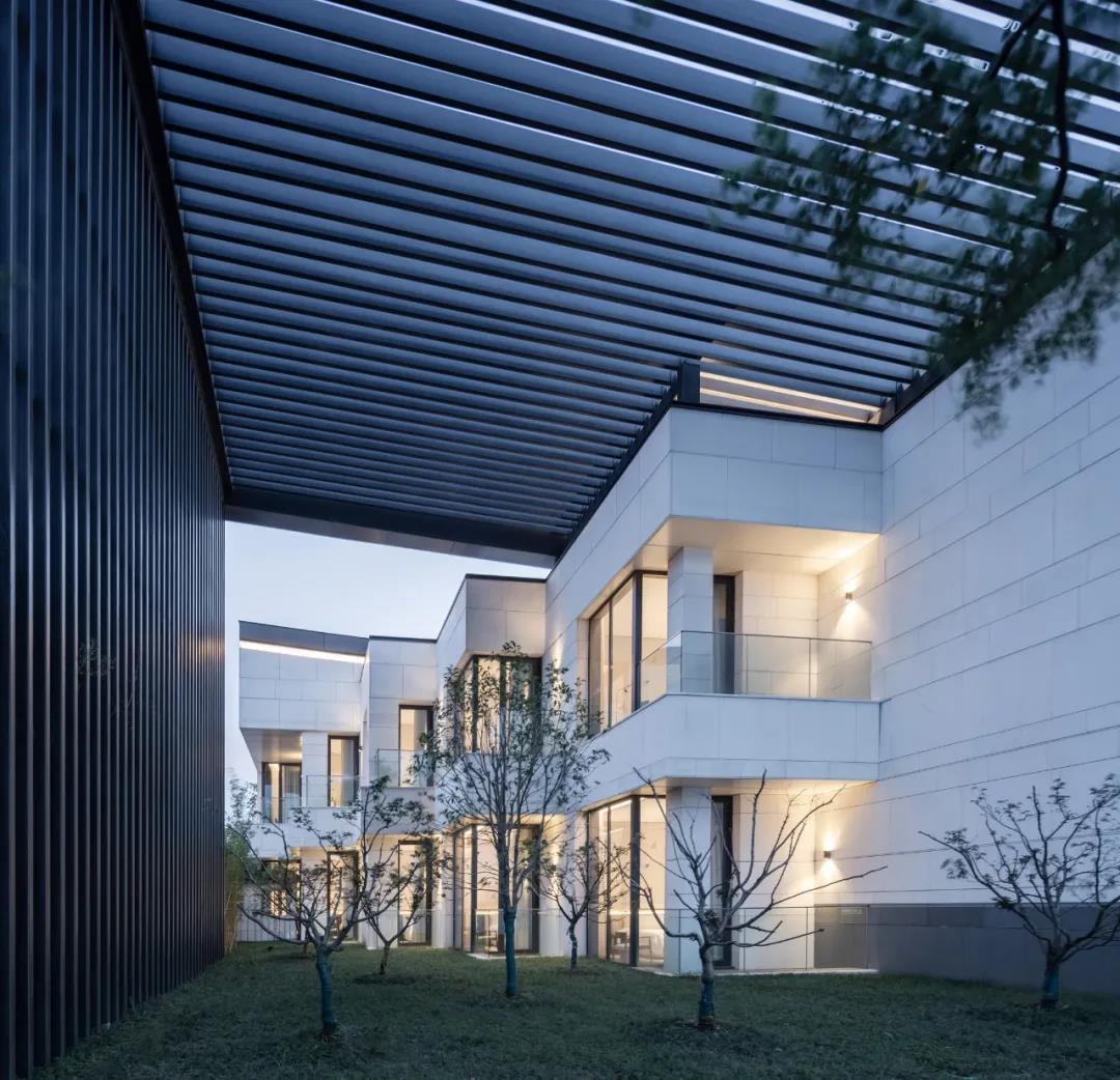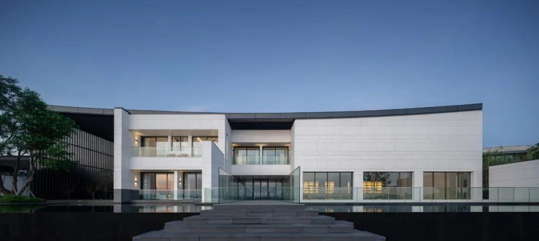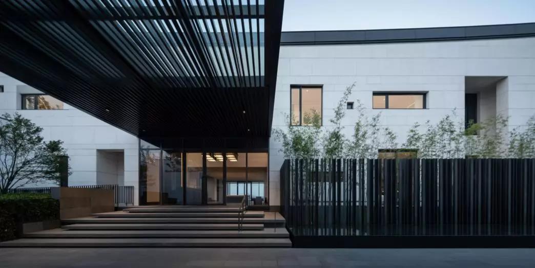 建筑采用两种色调,白色与深灰色。选用质感与耐久并重的白色砂岩和铝材,以现代工业技术呼应江南的水墨意境,与当地民居院落的形象保持一致,微妙谦和地融入环境。