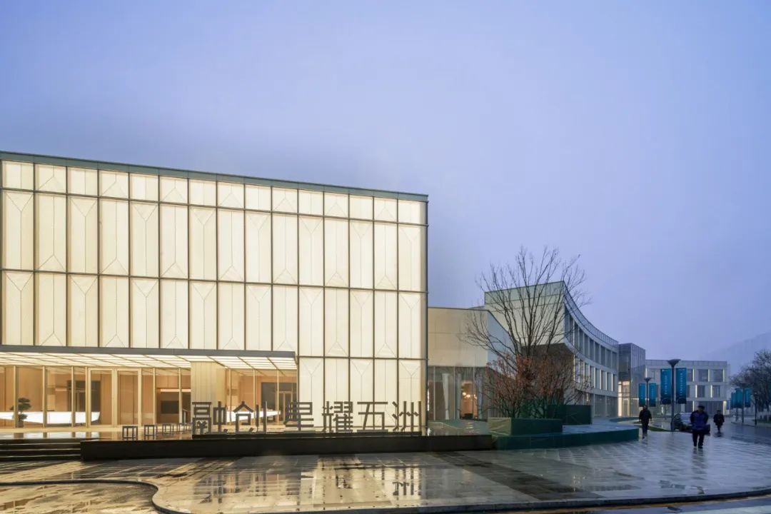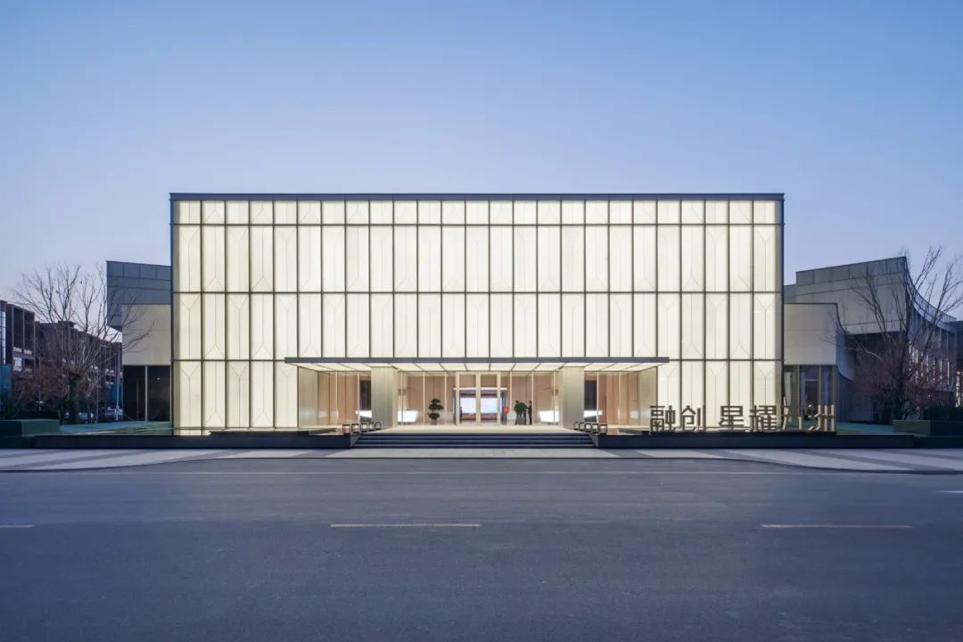 星耀五洲接待中心在建成后以一种典雅细腻的姿态呈现在天嘉湖畔,当夜幕降临,灯光开启,主入口的体量宛如一轮方形的月亮,照耀整个片区。