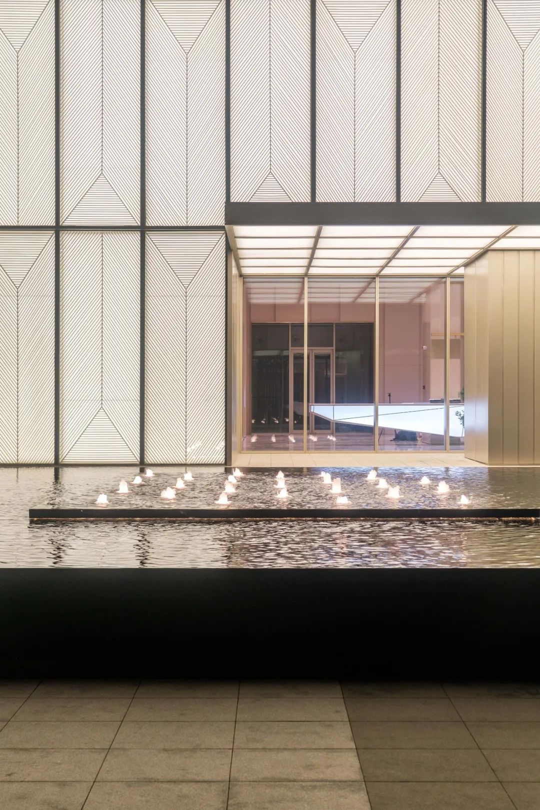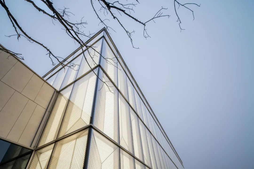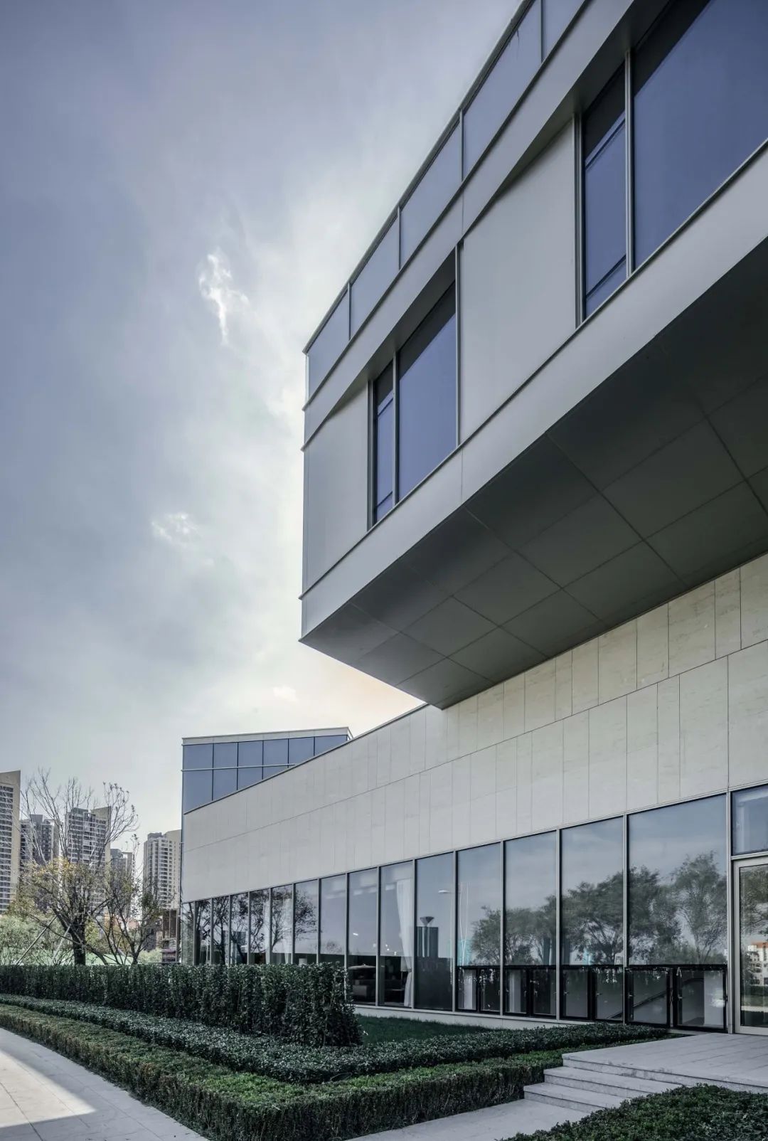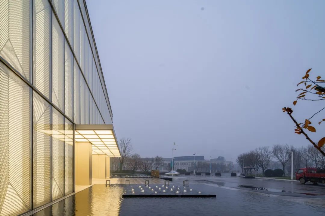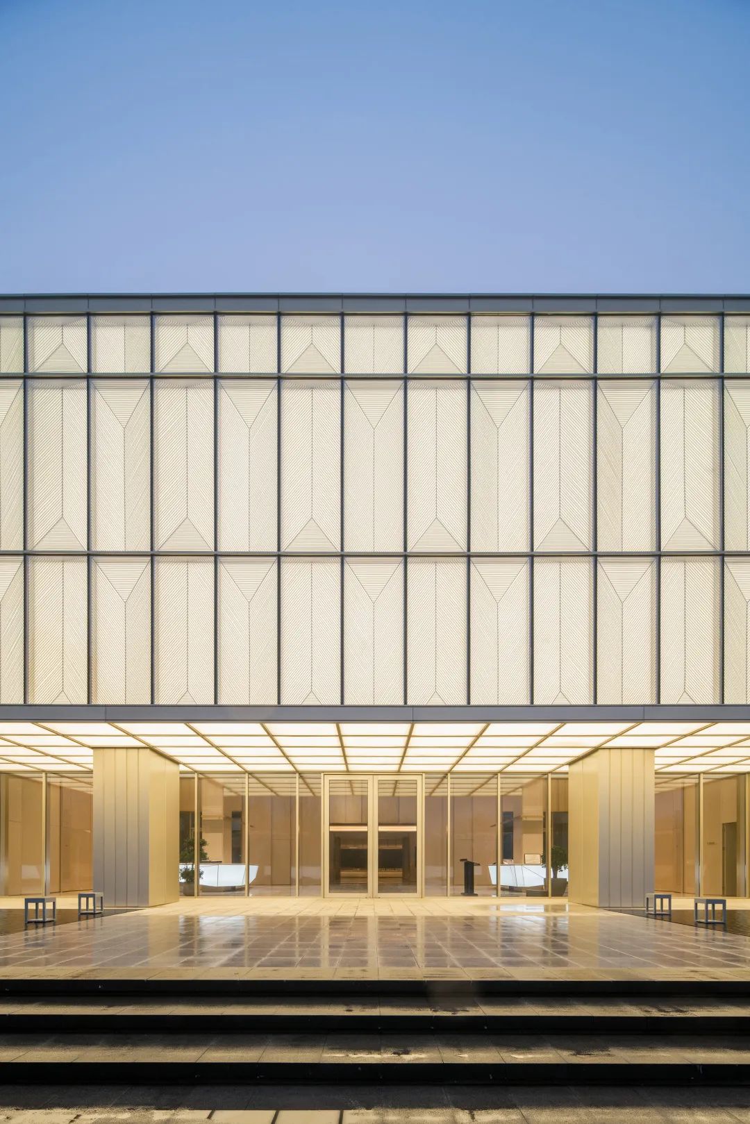 门厅及展厅采用的是玻璃幕墙,以保证充足的光线,内层再通过格栅或者穿孔板处理使得光线更柔和均匀。可以说阴影的存在是对光的表达,白天太阳打下来,立面上相对铝板面内凹的方窗也好,不锈钢格栅也好,都留下了时刻变化的丰富而细腻的阴影。