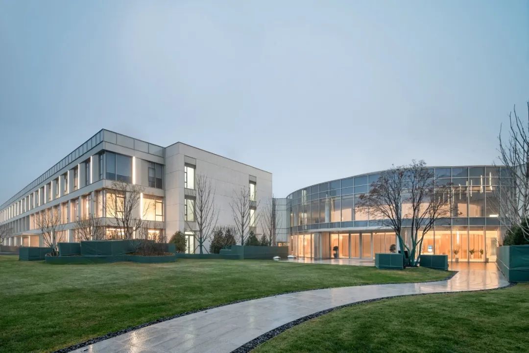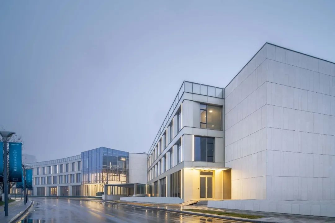 到了夜晚,除了室内灯光从夜色中泛出来,建筑立面上还布有错落有致的竖向灯带,主入口门厅则整个盒子都透亮了起来。