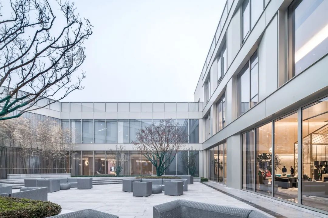在改造方案中充分利用了建筑原有的庭院,为了将庭院景观最大程度地引入室内,一层沿庭院一圈用了落地玻璃或者中轴旋转门,当中轴旋转门打开来,室内外空间及光线融合了在一起。