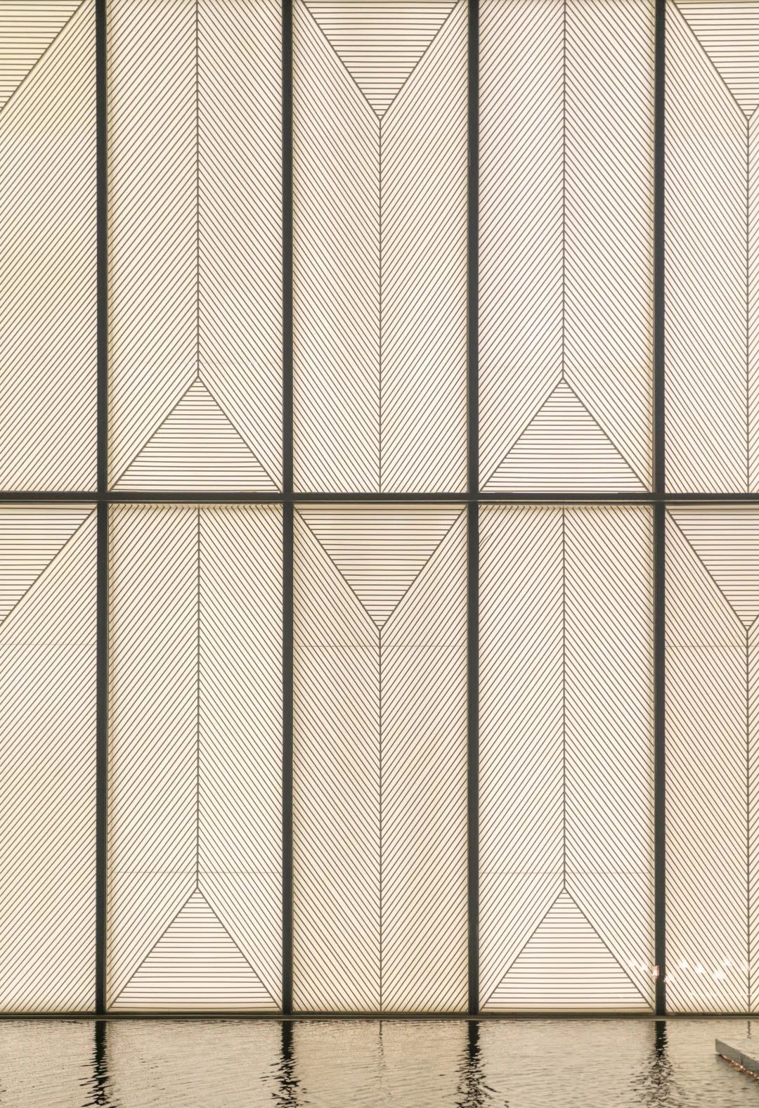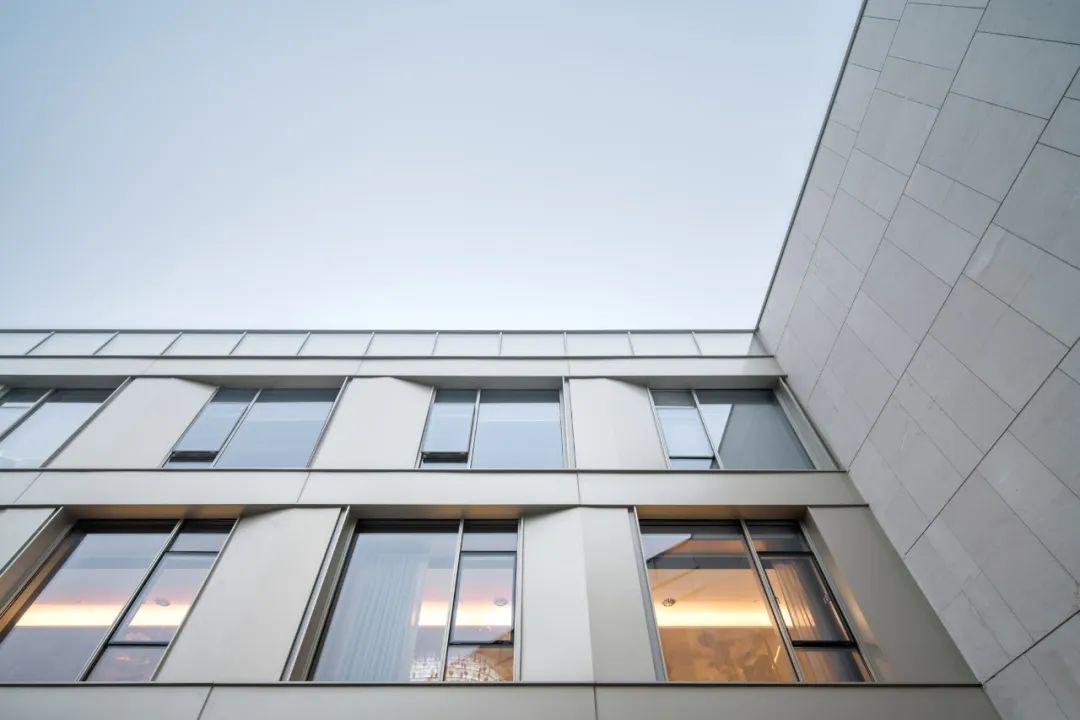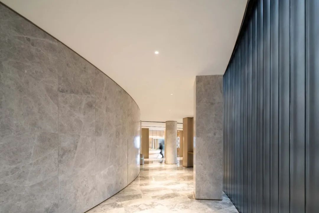 石材选用的是有着自然纹路的米白色砂岩,全部采用开放式干挂系统,石材的拼接有3mm、8mm以及15mm三种缝宽,大面上去以后不同缝宽的拼接组织呈现出富有韵律的划分。