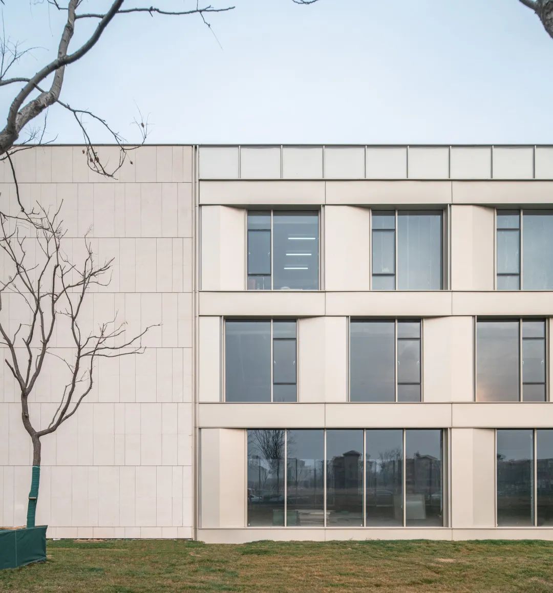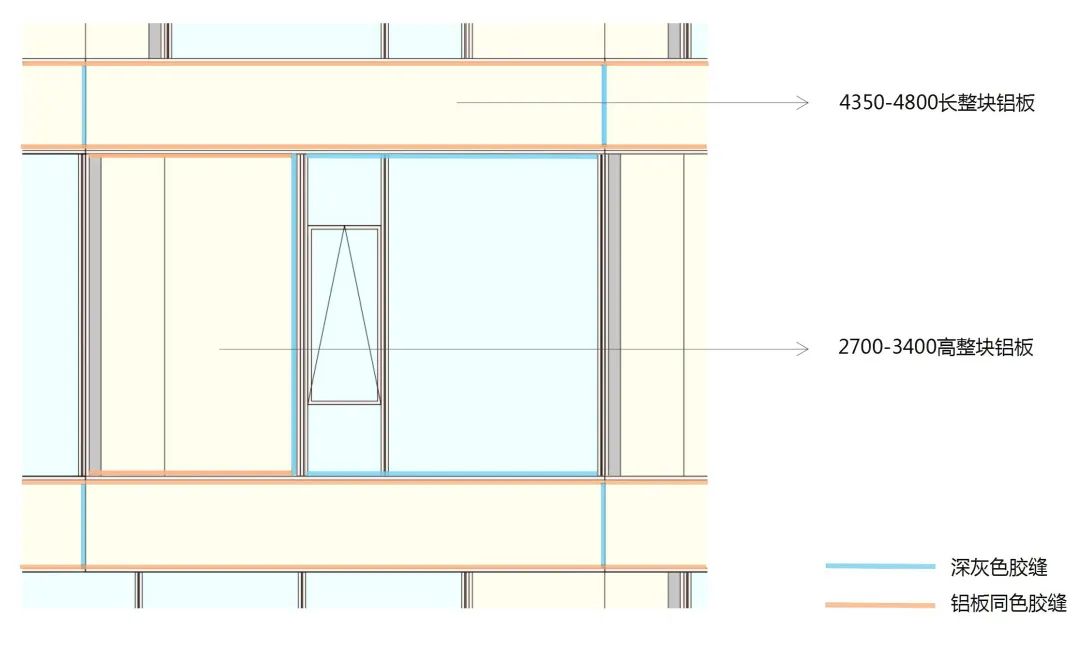 为了跟整个片区的色调一致,铝板选用的是温和的浅香槟色,铝板的划分做到尽可能的大,宽度最大尺寸有2m,长度则达4.8m,尺寸过大带来的可能不平整的问题通过铝板背面做加强筋来处理。