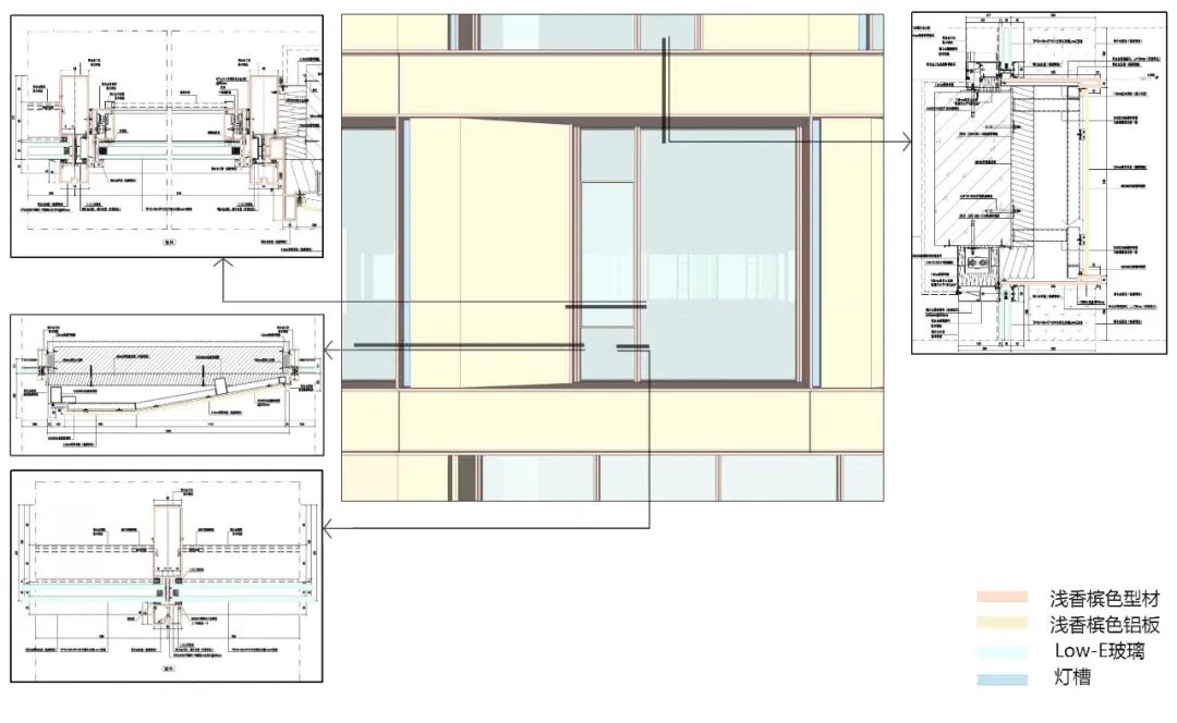 建筑的节点充分考虑了材料特性的表达以及施工的完成度,除了每种材料自身幕墙体系的节点收口以外,玻璃和铝板以及石材之间的交接也都通过型材来过渡,使得整个建筑的视觉尺度更小更细腻。