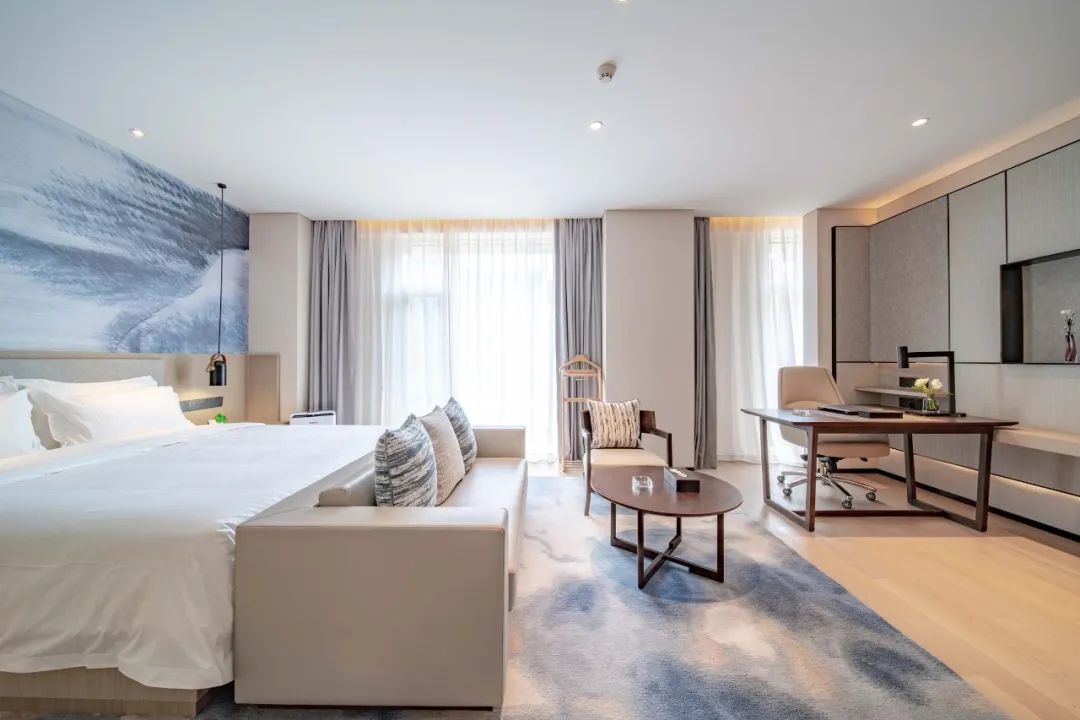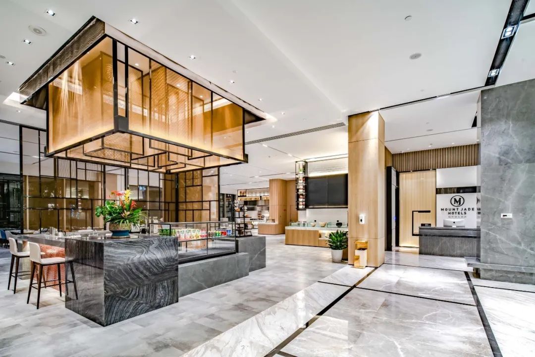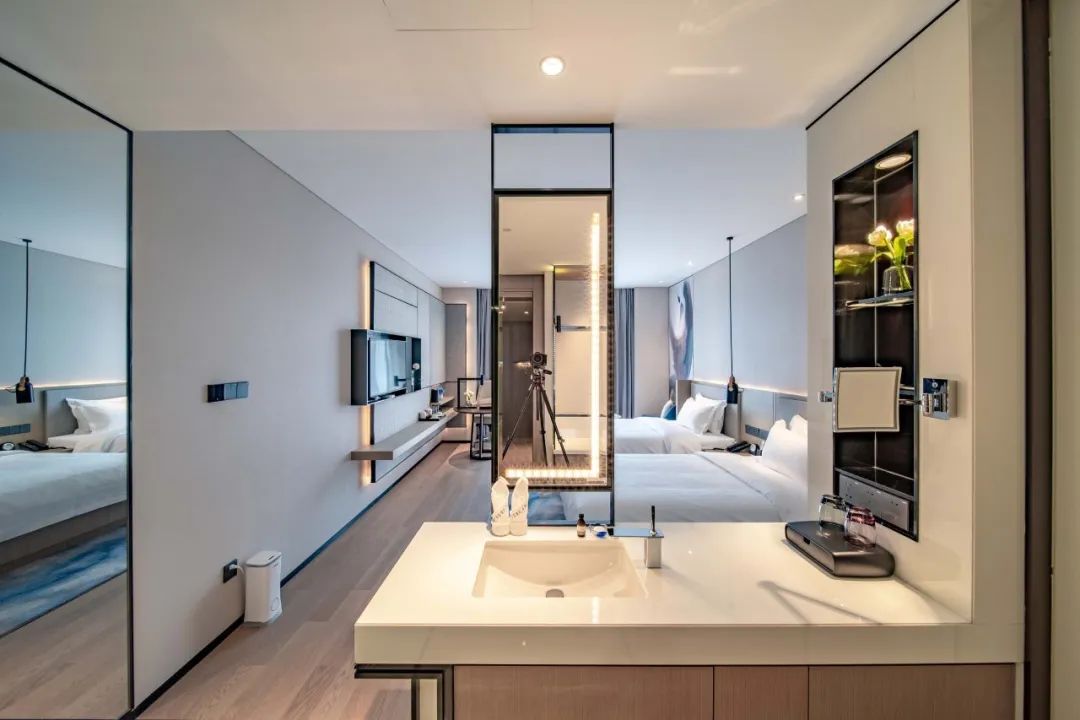 比如酒店和办公区域在保证客房以及办公空间采光充足的前提下,都采用单元窗形式,一个个方窗与铝板形成内凹关系,同时窗的一个边斜切到铝板完成面,窗与窗上下斜面错开,加上竖向灯带的形成了错落有致的韵律感及阴影关系。