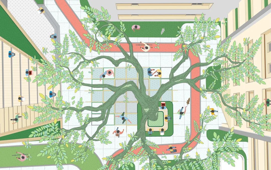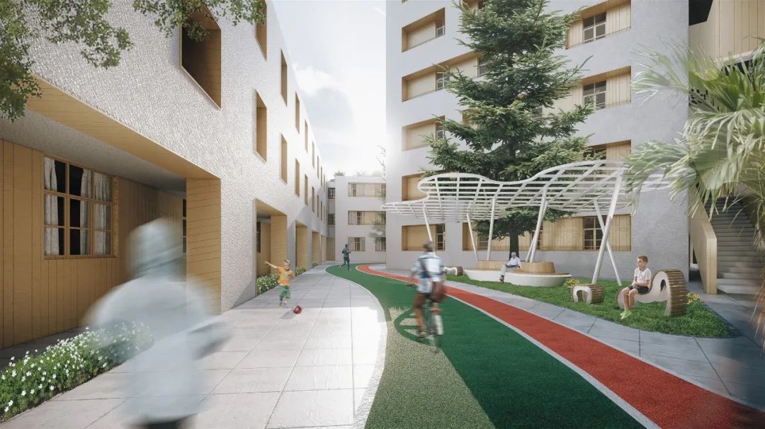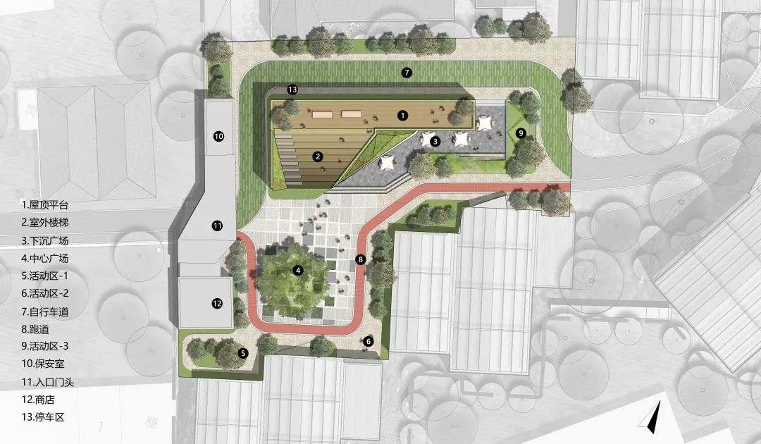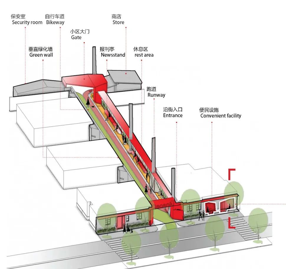 同时引入跑道,在保证功能流线合理的同时,通过运营活动,调节邻里关系,重建社区活力。