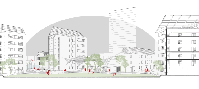 主题广场:原小区入口处商店属于后期搭建的便民空间,但它的存在使小区入口变得狭小无序,此次改造我们将原来的商店拆除,并以一种新的形式呈现,将这种对公共空间的消极占有转移为一种积极的元素,新建筑屋面演化为观景台阶,缓缓降至广场边,试图与周边建筑生长一处,又呈现微妙的差异,它和周边居民楼的窗口、阳台和屋顶也共同营造出立体围合的城市剧场,人们拾级而坐,演绎出一幕幕活色生香、众声喧哗的城市戏剧。