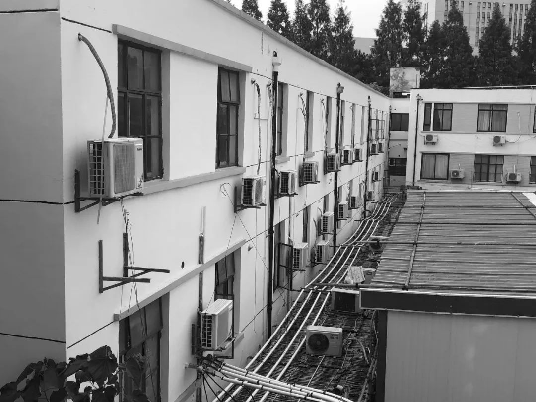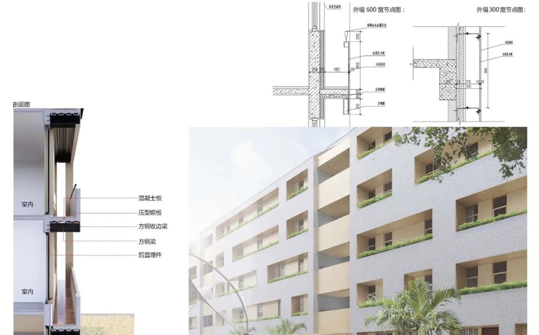 改造后的立面,由外墙出挑钢结构梁、混凝土板搭建而成,我们根据不同楼栋,分别出挑900mm和600mm,旧式空调置于新立面表皮之内。外墙以浅色涂料为主,整体立面更加大气、简洁。