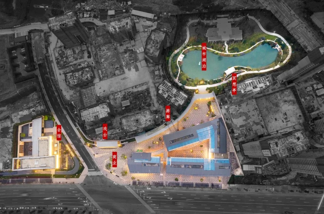 活力轴起于会馆,商业与会馆临街相对,戏台正对街角,戏台一侧是游廊,随廊深入,城市湖泊映入眼帘。