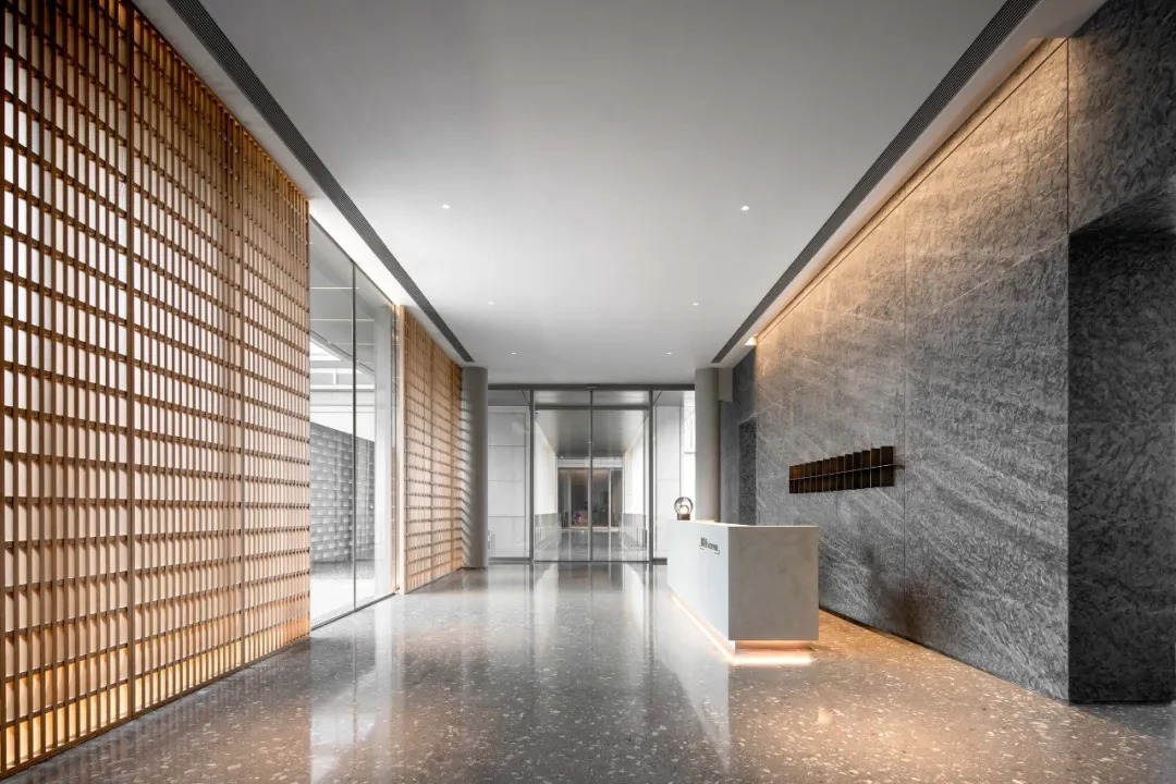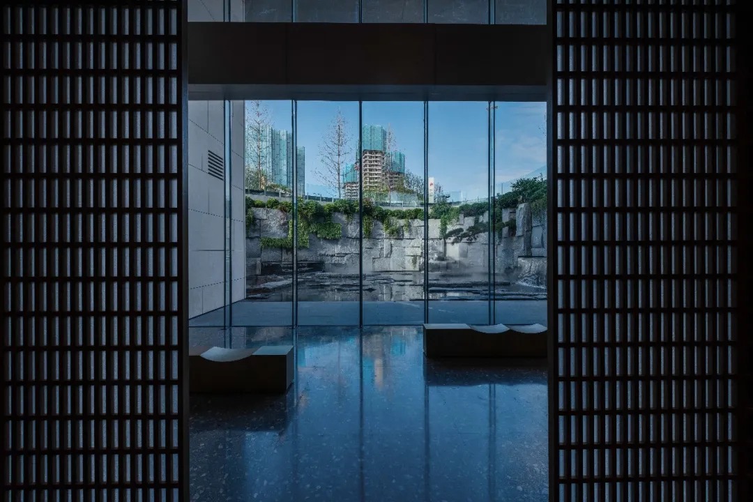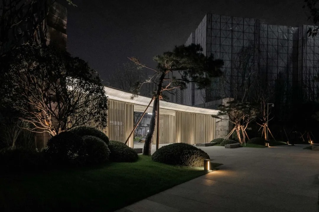 预接待厅是一个颇具仪式感的入口,步道平水面,临水漫步,入夜,两侧金属砖墙的呼吸灯映入水中,宛若星空。