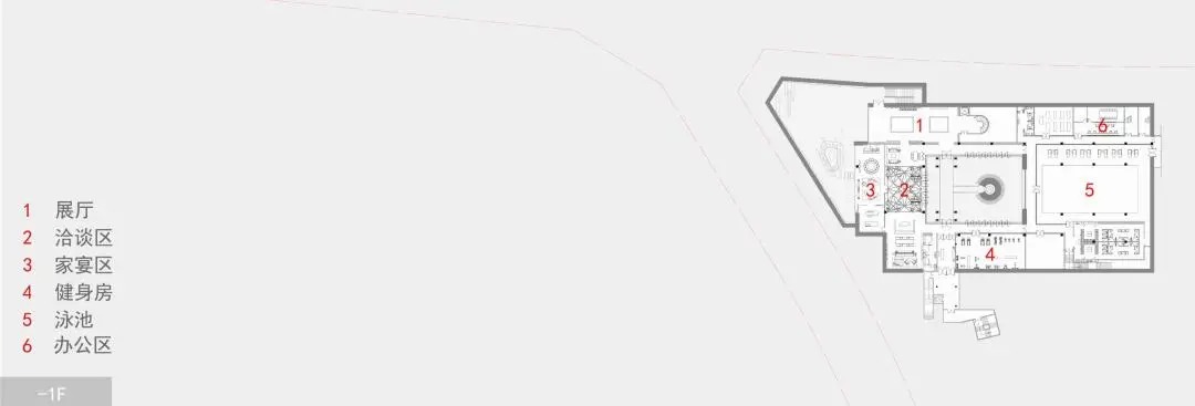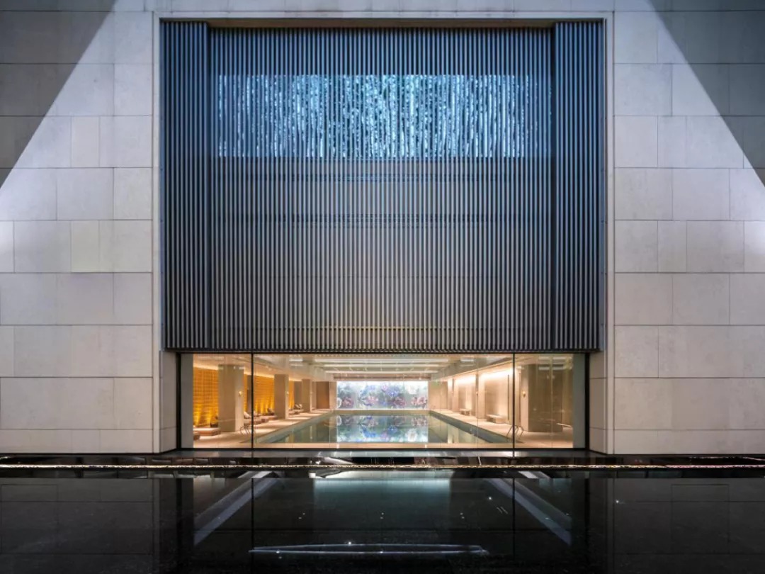 会馆水院是一个内向型院落,三面转轴玻璃门相对,泳池一侧布置的6米宽超白玻,弱化室内外空间界限。