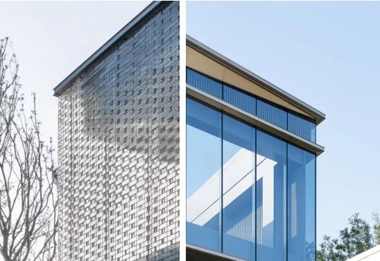 沿街立面采用高反射玻璃,使得形体更为简洁纯粹,同时反射使得建筑更加融入街道,融入城市。