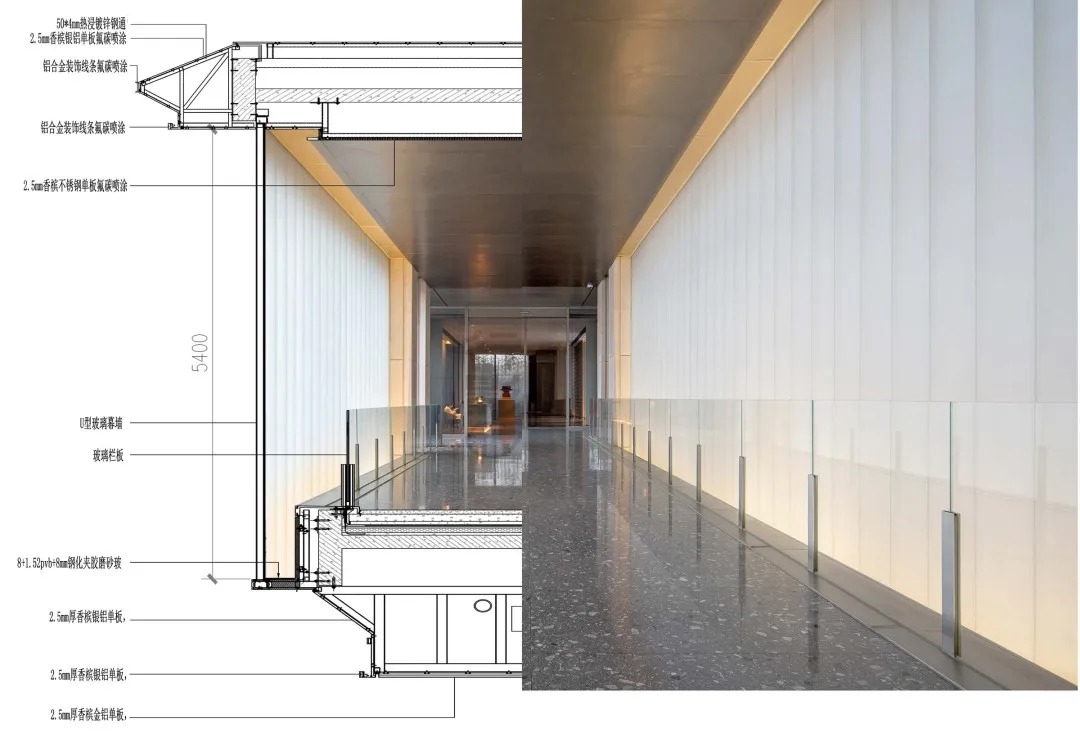 会馆廊桥空间简洁纯粹,具有一定的精神性。空间的塑造主要靠两侧的U玻和上下的界面,隐藏U玻的上下连接节点,让桥更具漂浮感。