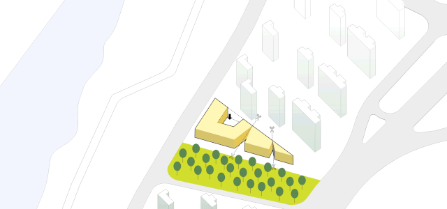 涡阳南路与河岸线匆忙地照面便分道扬镳,留下的楔形地块冲着河边豁口大开,有一种劲想要摆脱束缚。顺着这股劲,建筑堆积起最原始的体积,将主要的分量向临河的一端集中,进深越大高度越大,从西南角望去,就像从远处冲来的巨型列车,冻结在眼前。