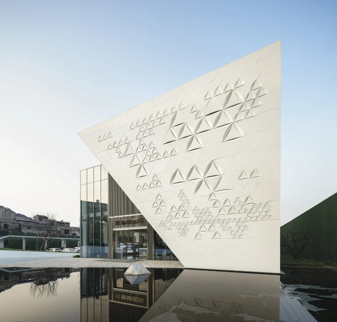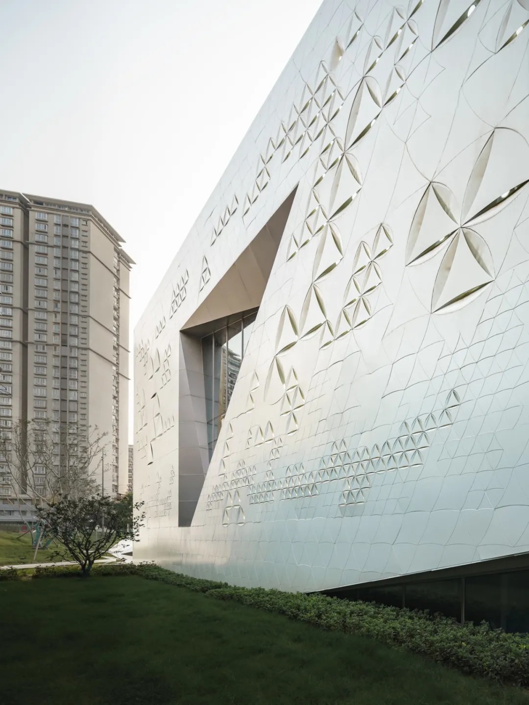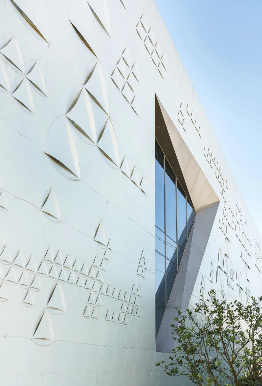 建筑形体是温和的,但细节手法是锐利的,我们把三角形切割的手法一以贯之,从总图景观到建筑虚实分割到表皮元素设计最后到灰空间穿孔板元素运用。再赋予珍珠白的温度,使整个建筑典雅却不失冲击力。