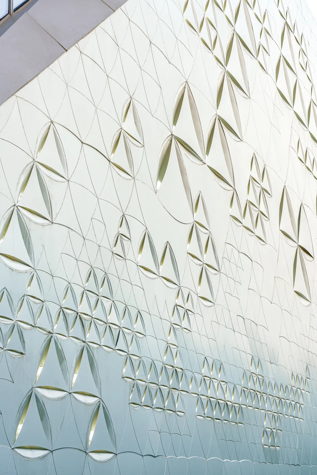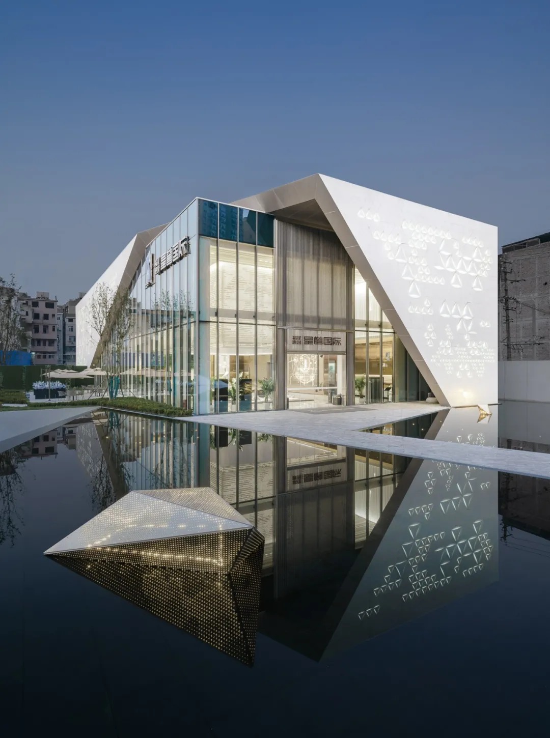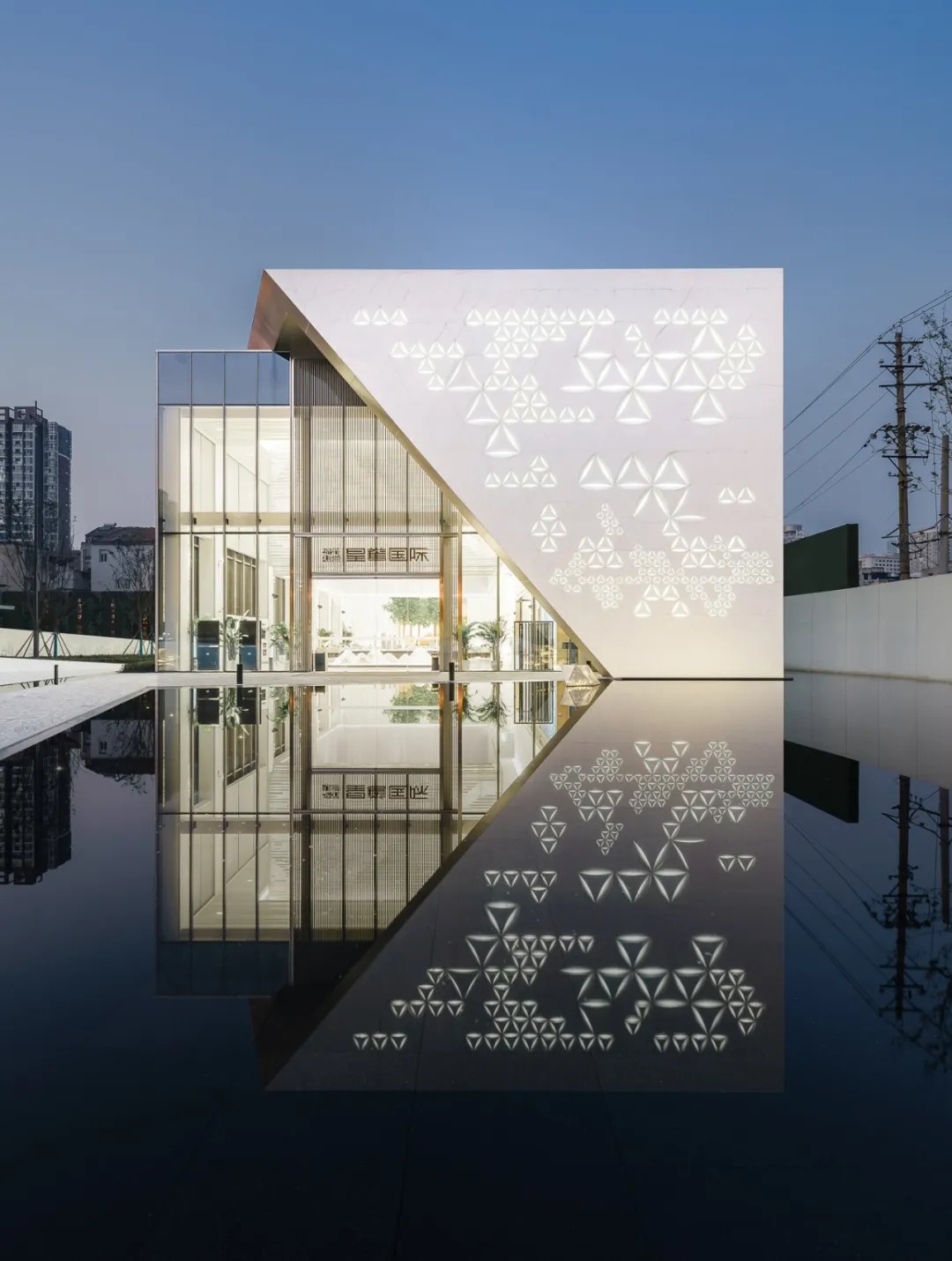 建筑形体是温和的,但细节手法是锐利的,我们把三角形切割的手法一以贯之,从总图景观到建筑虚实分割到表皮元素设计最后到灰空间穿孔板元素运用。再赋予珍珠白的温度,使整个建筑典雅却不失冲击力。