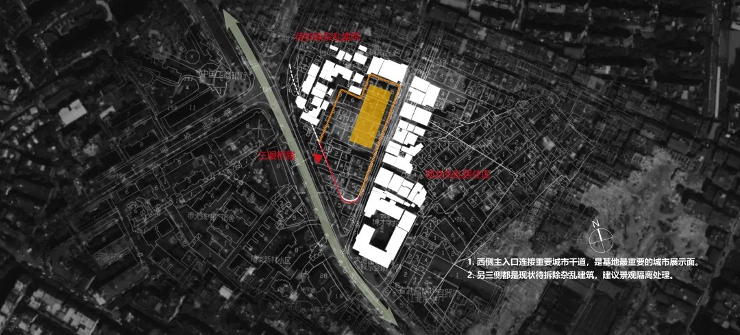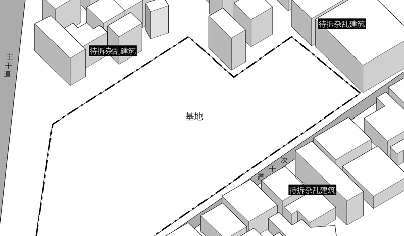 项目位于武汉市三眼桥路,基地周边均为密集生长的建筑体量。内部场所被淹没在杂乱无章的老建筑群中,外部界面被林立的破旧矮墙所蚕食。
