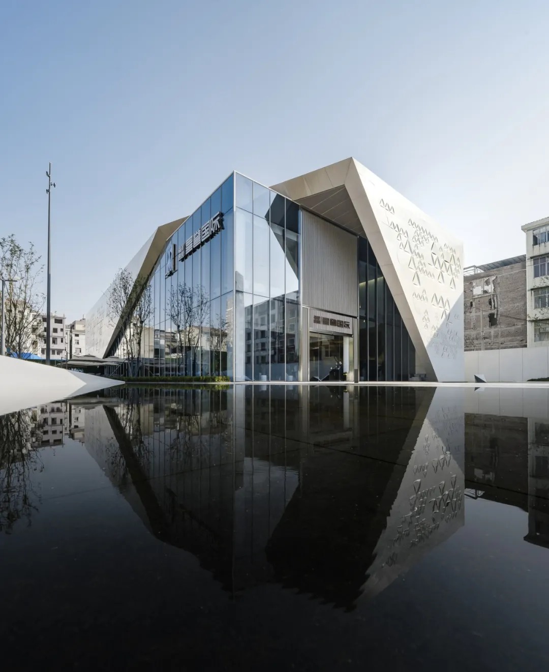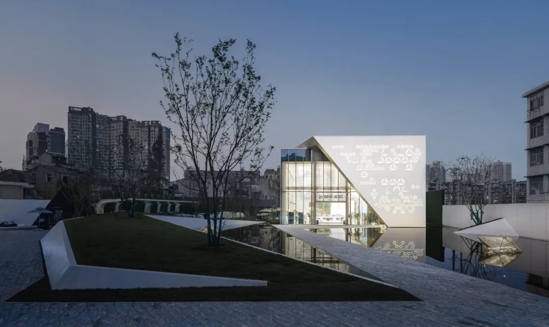 基地周边多为待拆杂乱居民区,设计时,纯粹清透的玻璃体外部包裹中式营造的建筑肌理,隔绝四周不利的环境;依据人流来向,切割外壳两端,露出内部干净的玻璃体,面向城市界面打开。