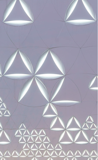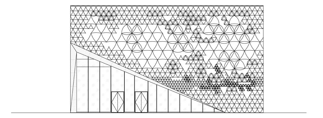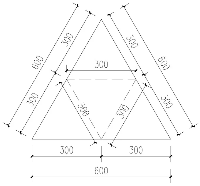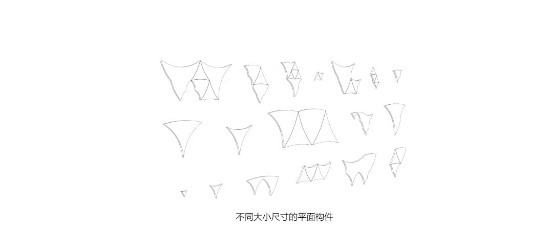 以最小的模数单元为基础,组合成三种不同大小的立面模块。其分别为1个模数单元组成的边长为300mm的正三角形模块,4个模数单元组合成的边长为600mm的正三角形模块以及16个模数单元组合成的边长为1200mm的正三角形模块。