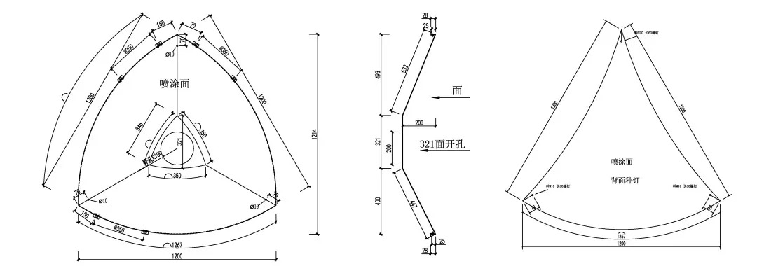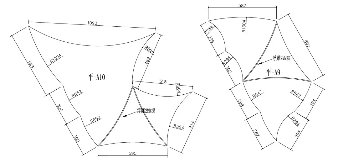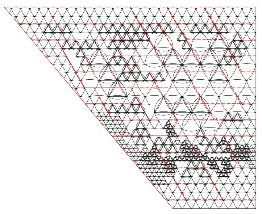 三维模块的平面生成是以各个三角形的顶点为圆心,分别做半径为300mm,600mm,1200mm的圆,圆弧与三角形各个顶点相交,从而形成的外部弧线为曲面模块的边缘。