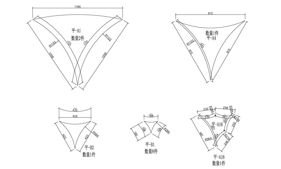 平面构件以各个曲线相交处为界限进行划分,分割为不同形状尺寸的单块区域铝板,为了保证施工平整度和工期,还将部分平面图案以刻线的形式反映在单块区域内,尽量以大面铝板进行拼接,为此整个项目设计了共28中不同类型的平面构件,3种不同类型的曲面构件。