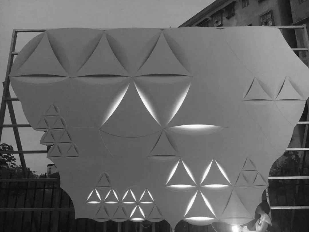 反复思考之下,我们选用了三角形作为基本的模数形式,追其原因有二,一者对三角地形的一个强化,我们希望把这个元素贯穿到每一个空间,无论是景观还是建筑。二者也想模拟星空的形状,在童话里每一颗星星都代表着对老城的一段记忆,也是对未来的一种探索。