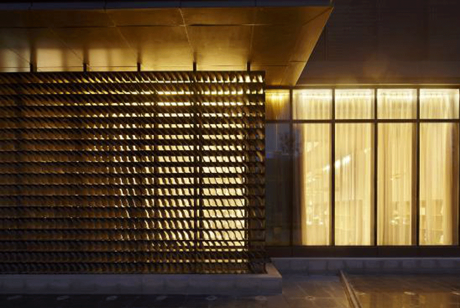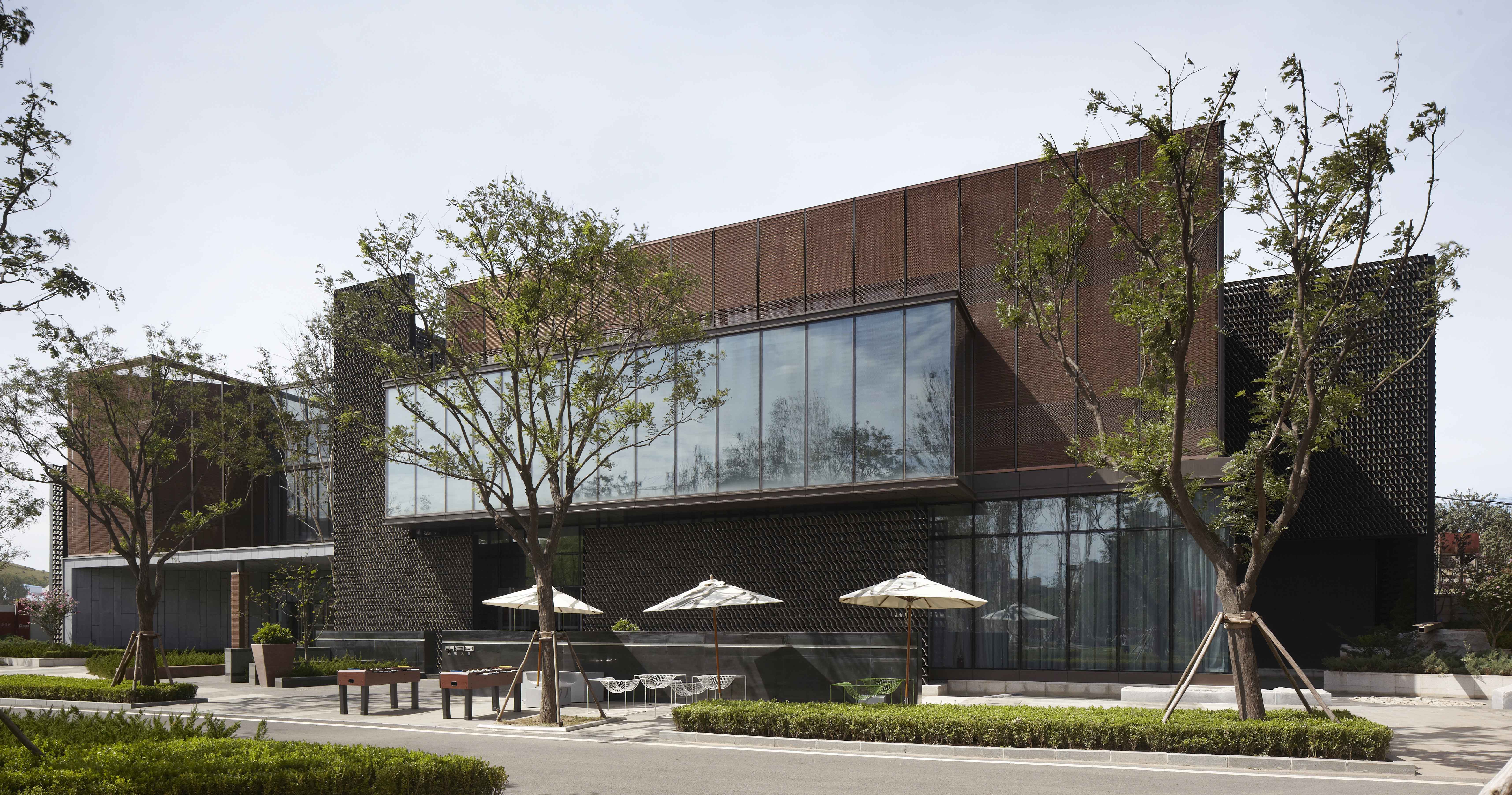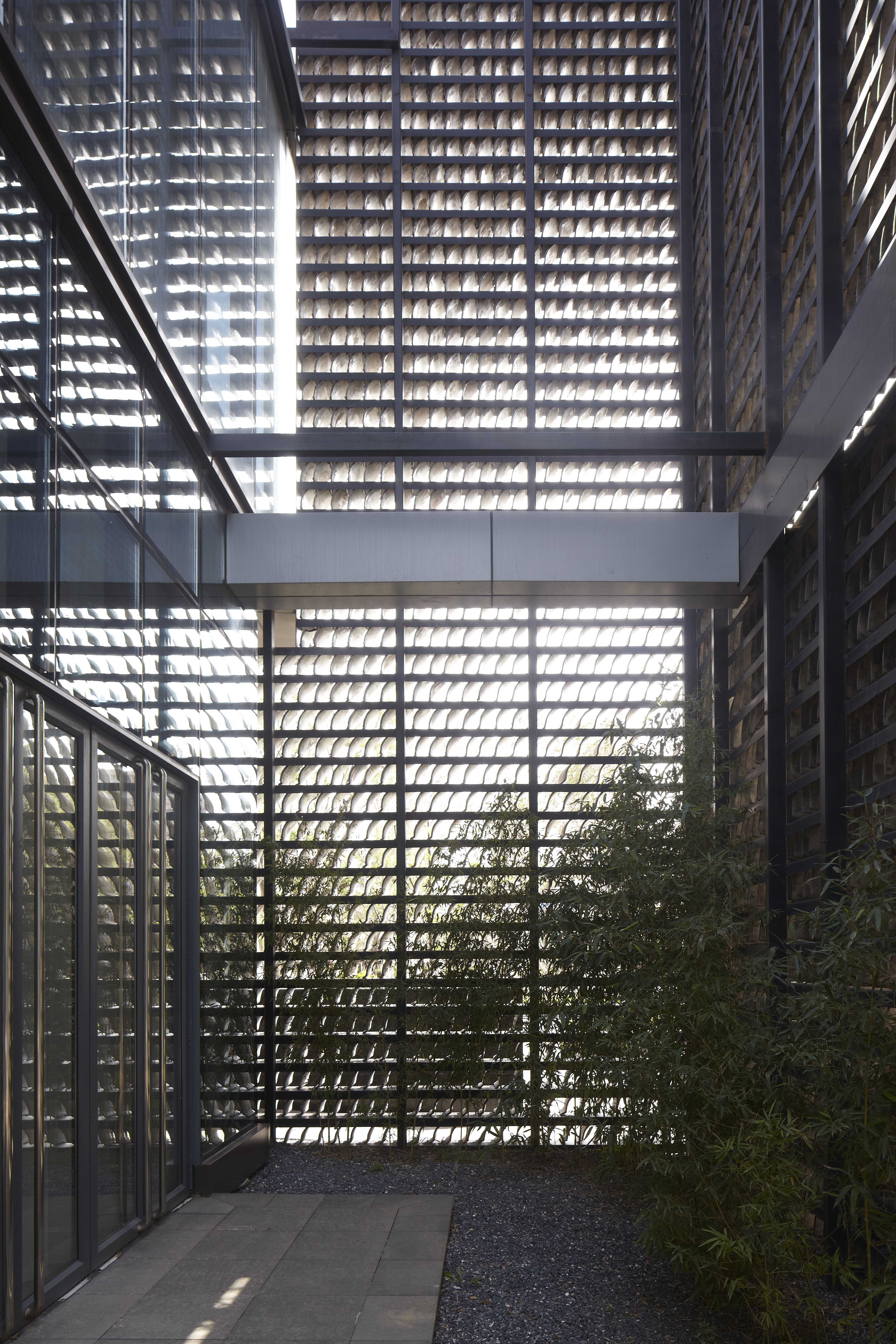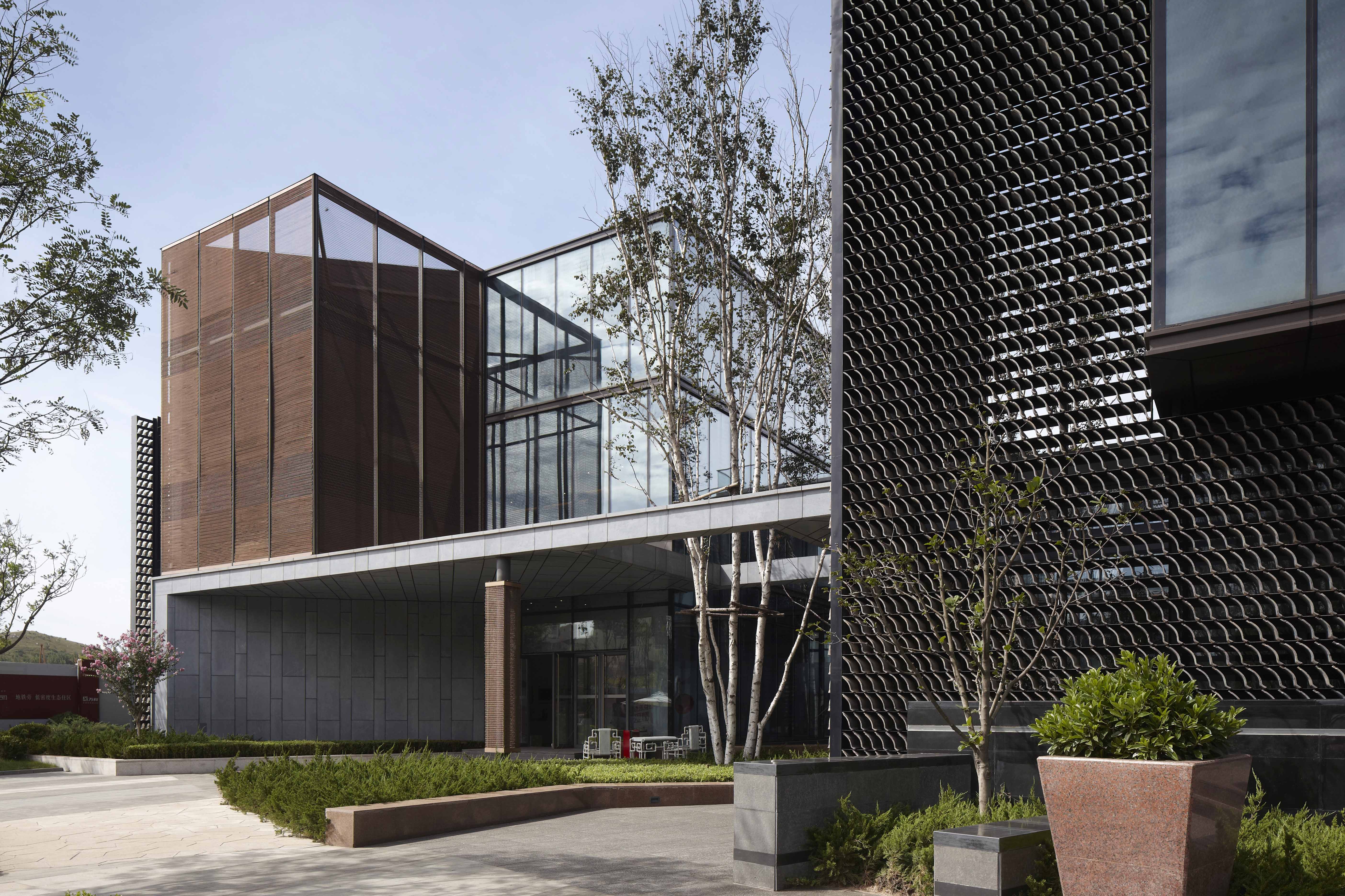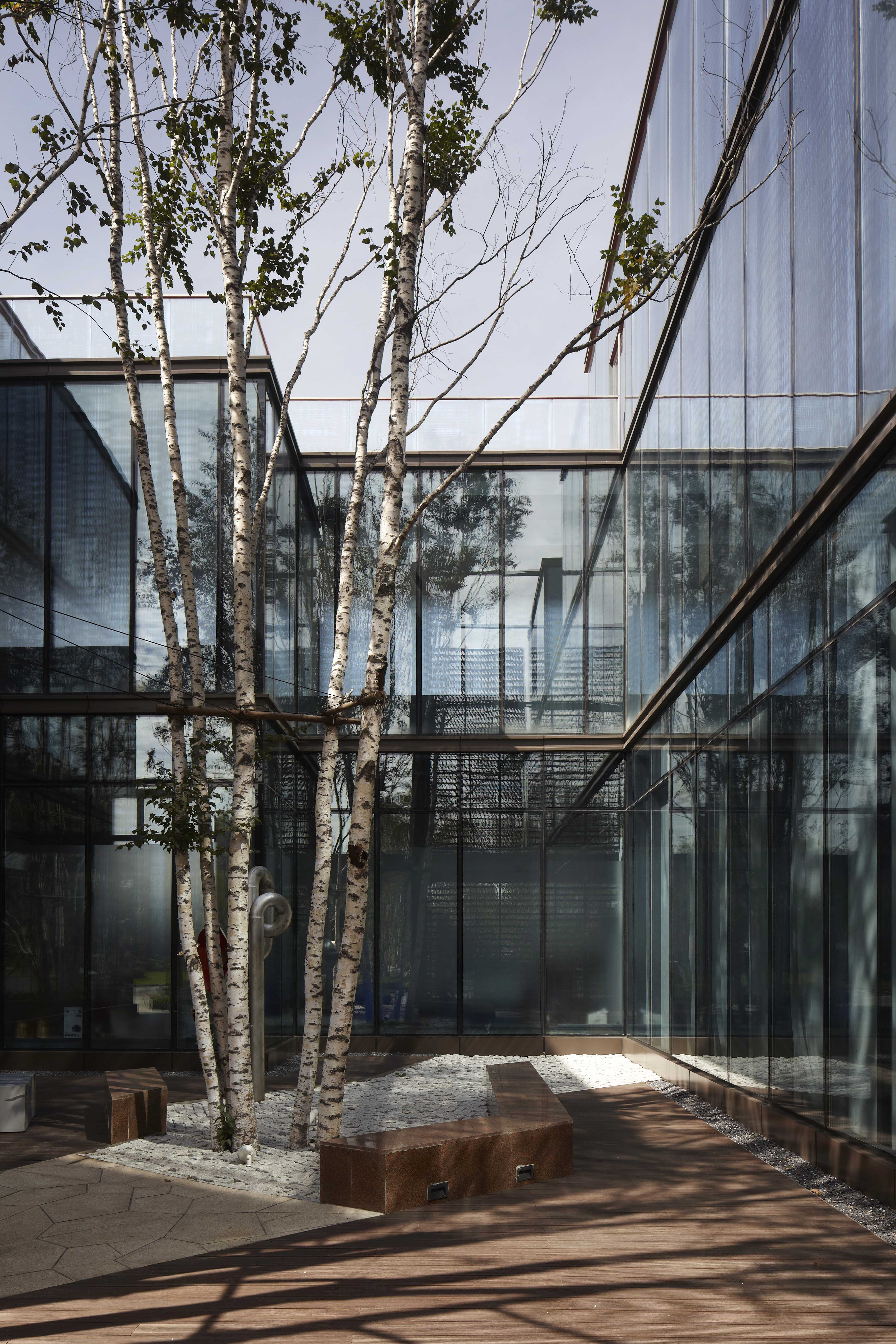 于是保留的白桦树与瓦片决定加入于工程模数之间的游戏,由于它们的加入6Mx6M 的模数方块变得生动起来——业主期待在这块不大的长方形地块有不小于的2500 ㎡的展览以及办公面积,用模数方块铺满基地,加减出必要的灰空间基本满足要求。但这种凹凸是机械的,加入必要的人情意味是调节剂。用虚灵的玻璃面围合出白桦树的表演舞台,成为整个场地的精神所在。以钢片为龛,瓦片形成书架般排列的半虚表皮,完成瓦还在高处看风景的愿望。