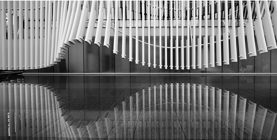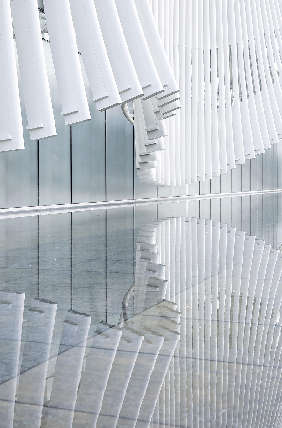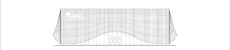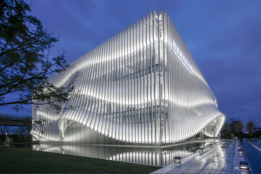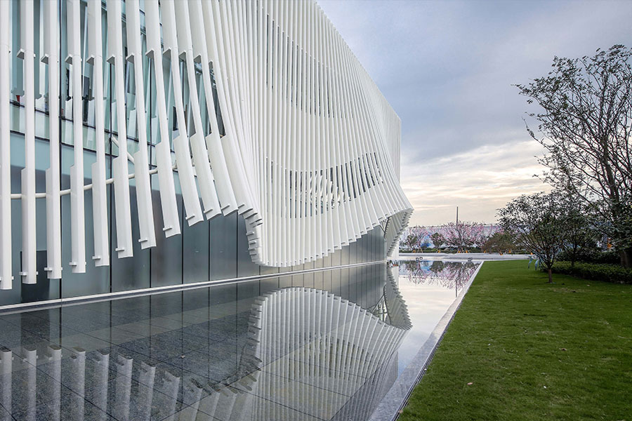 外表皮肌理采用铝方通杆件,外表皮大小与间距组成的标准片段与建筑柱网严格对应。每根杆件分为五等分,内侧做暗纹处理,同时杆件端部做卷起处理,使建筑更增柔美灵动。